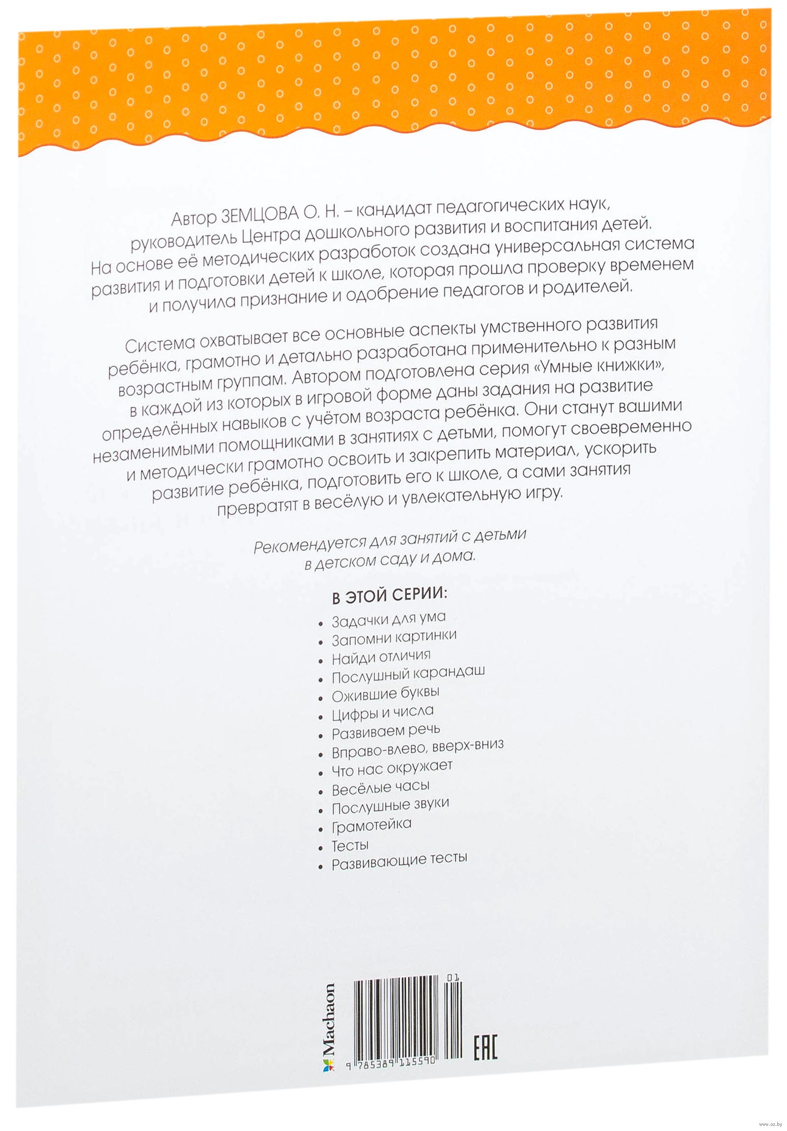 "Автор Земцова О. Н. – кандидат педагогических наук, руководитель Центра дошкольного развития и воспитания детей. На основе её методических разработок создана универсальная система развития и подготовки детей к школе, которая прошла проверку временем и получила признание и одобрение педагогов и родителей. Система охватывает все основные аспекты умственного развития ребёнка, грамотно и детально разработана применительно к разным возрастным группам. Автором подготовлена серия «Умные книжки», в каждой из которых в игровой форме даны задания на развитие определённых навыков с учётом возраста ребёнка. Они станут вашими незаменимыми помощниками в занятиях с детьми, помогут своевременно и методически грамотно освоить и закрепить материал, ускорить развитие ребёнка, подготовить его к школе, а сами занятия превратят в весёлую и увлекательную игру. Рекомендуется для занятий с детьми в детском саду и дома."