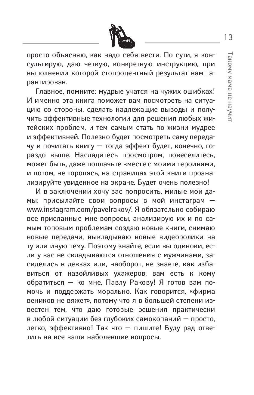 Новая книга Павла Ракова дарит новые уникальные возможности всем женщинам, которые хотят выйти замуж и прожить с любимым мужем долгую и счастливую жизнь. В игровых ситуациях участницы тренинга заново переживают те обстоятельства, в которых оказывались в жизни: выбор жениха, первое свидание, свадьба, знакомство с родственниками, измена мужа, появление любовников, развод. Переосмыслив каждый этап своего жизненного пути, женщины благодаря Павлу Ракову понимали, где и какие совершали ошибки и как их нужно исправить, чтобы жизнь снова заладилась. Павел Раков доступно объясняет, как себя вести женщинам, чтобы их мужчина всегда оставался любящим, добрым, работящим, веселым, заботливым, счастливым и, главное, успешным.