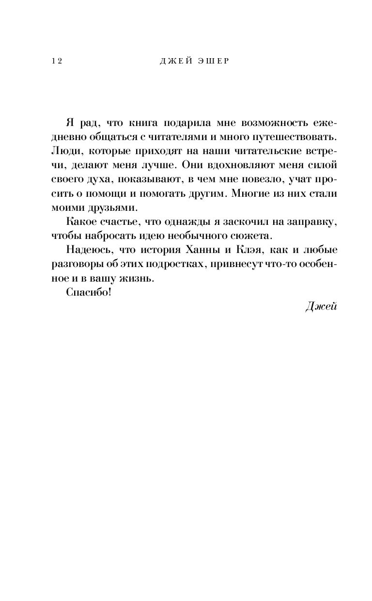 Замечательная книга):)️ Легко и быстро читается) Рекомендую) :):) Очень похоже на сериал. Но не прям точь в точь. В сериале несколько дней Клэй слушал кассеты, а в книге за одну ночь. Также порадовал шрифт(То, что говорит Ханна в кассете— одним, а то, что в реальности—другим)))):)