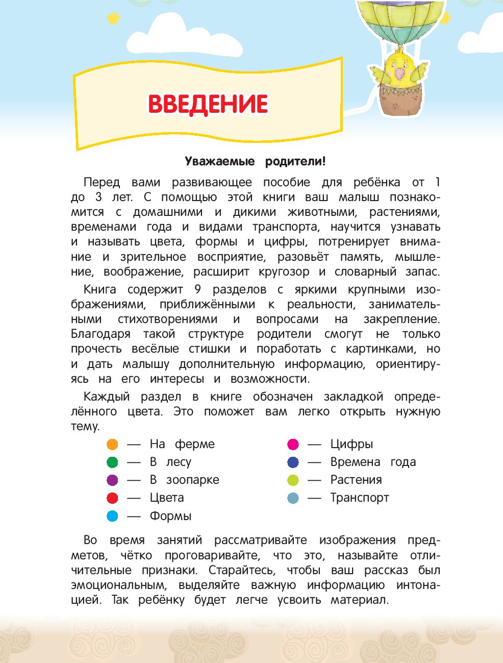 Красочное развивающее пособие поможет малышу ближе познакомиться с окружающим миром, превратив это знакомство в интересную познавательную игру. Книга содержит 9 разделов с яркими крупными наглядными картинками и занимательными стихами. Их тематика соответствует интересам и возможностям ребёнка от года до трёх. Он научится различать домашних и диких животных, растения, времена года, виды транспорта, запомнит цвета, формы и цифры, потренирует память, внимание, зрительное восприятие, расширит кругозор и словарный запас.