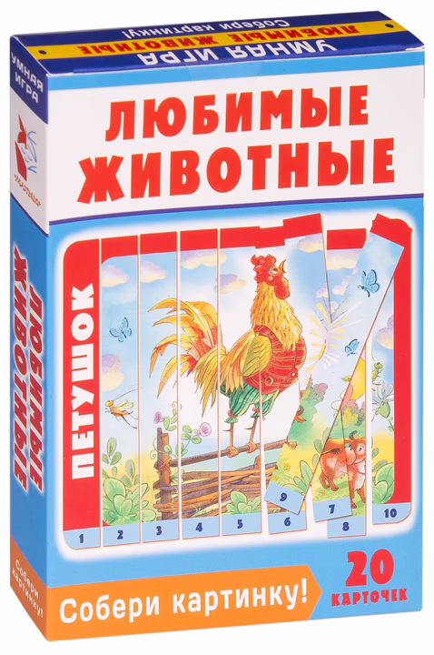 Пазлы-картинки «Любимые животные» – это красочные картинки с изображением двадцати животных. Малыш не только соберёт карточки-пазлы, но и сможет придумать маленькую историю про каждое животное.