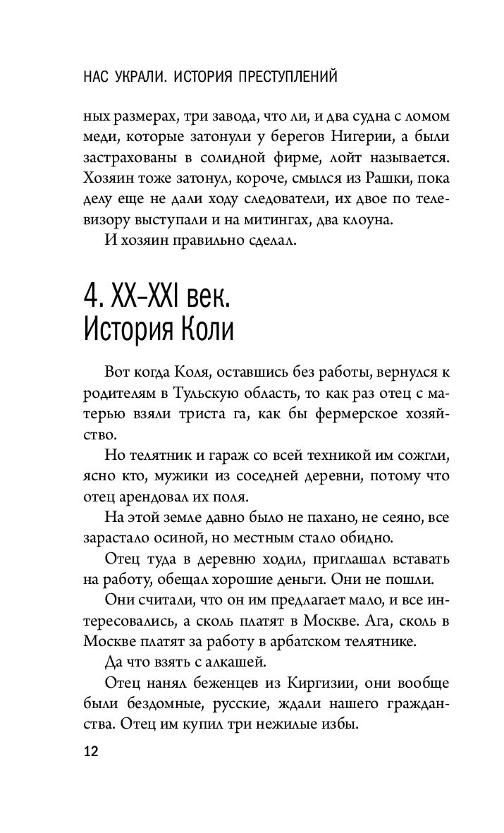 Роман "Нас украли. История преступлений" – это детектив нового поколения. В нем не действуют честные, умные следователи, класс, практически исчезнувший у нас. Это та история, в которой жертвы не хотят расследования, и тому есть причина. А вот что это за причина, читатели сами поймут к концу романа: ведь в каждом из нас сидит следователь, благородный, умный, не берущий взяток, стремящийся к истине и понимающий, что на свете есть такая странная вещь, как любовь.