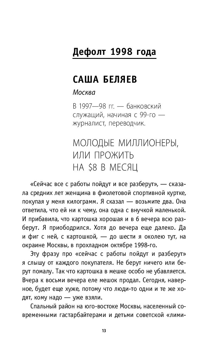 Трудно найти человека, который бы не вспоминал пережитые им 90-е годы прошлого века. И каждый воспринимает их по-разному: кто с ужасом или восхищением, кто с болью или удивлением… Время идет, а первое постсоветское десятилетие всё никак не отпускает нас. Не случайно на призыв прислать свои воспоминания откликнулось так много людей. Сто пятьдесят историй о лихих (а для кого-то святых) 90-х буквально шквалом ворвались в редакцию! Среди авторов – бывшие школьники, военные, актеры, бизнесмены, врачи, безработные, журналисты, преподаватели. В этой пронзительной коллективной исповеди нет ни грамма художественного вымысла или политической пропаганды, радужных мифов или надуманных страшилок. Всё написано предельно искренне, слова идут от души, от самого сердца! И вот результат: уникальные свидетельства очевидцев, самый компетентный, живой и увлекательный документ эпохи. Эта поистине народная книга читается на одном дыхании. Опубликованные здесь рассказы, эссе и зарисовки – подлинная реальность, которую сегодня трудно найти на ТВ и в кино, которую вряд ли рискнут издать журналы и газеты.