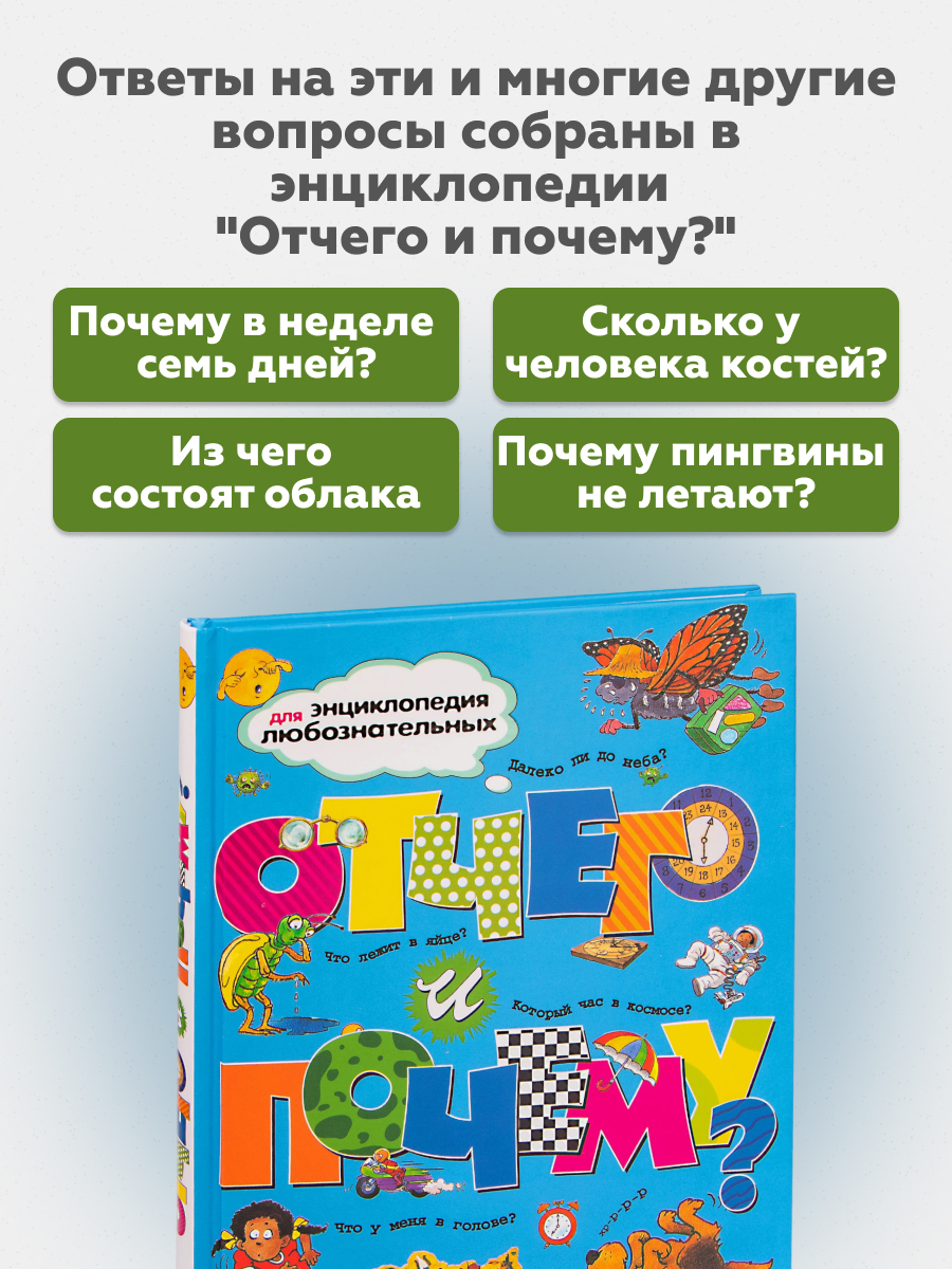 Ответы на эти и многие другие вопросы собраны в энциклопедии "Отчего и почему?". Это хорошо иллюстрированное издание расскажет детям о загадках природы и древних цивилизаций, об исторических событиях и легендарных личностях, о животных, растениях и человеке.
