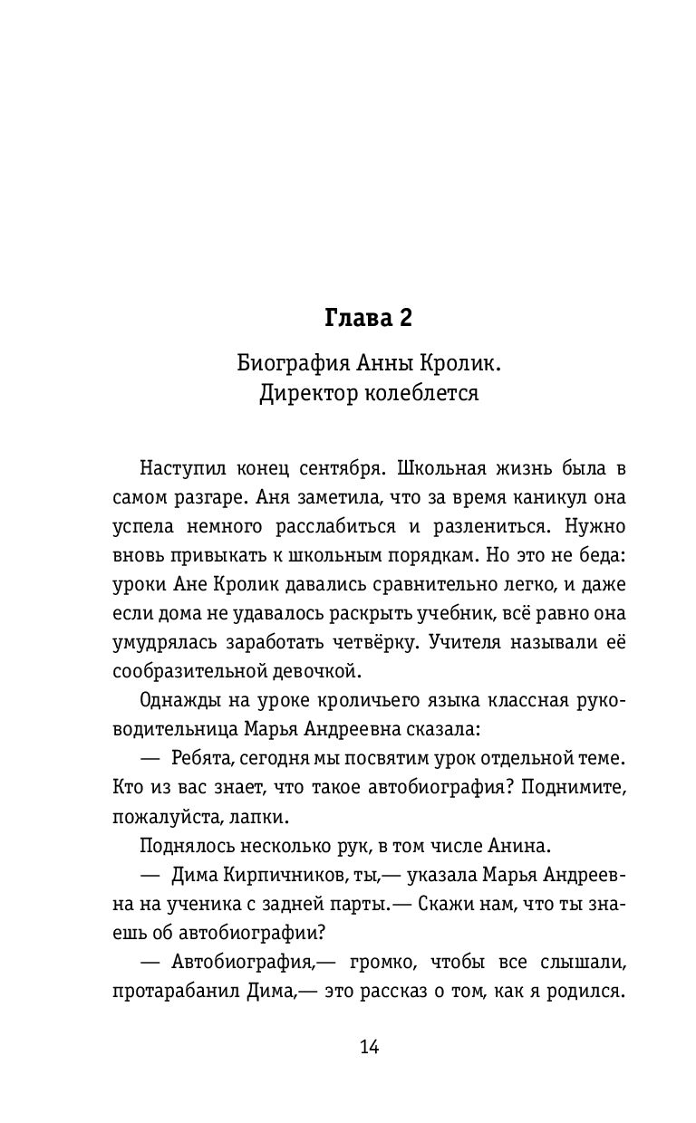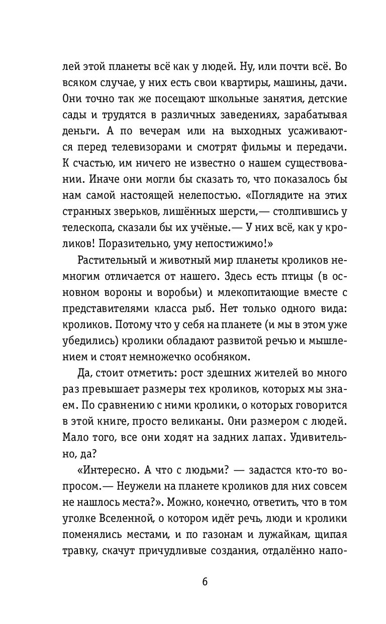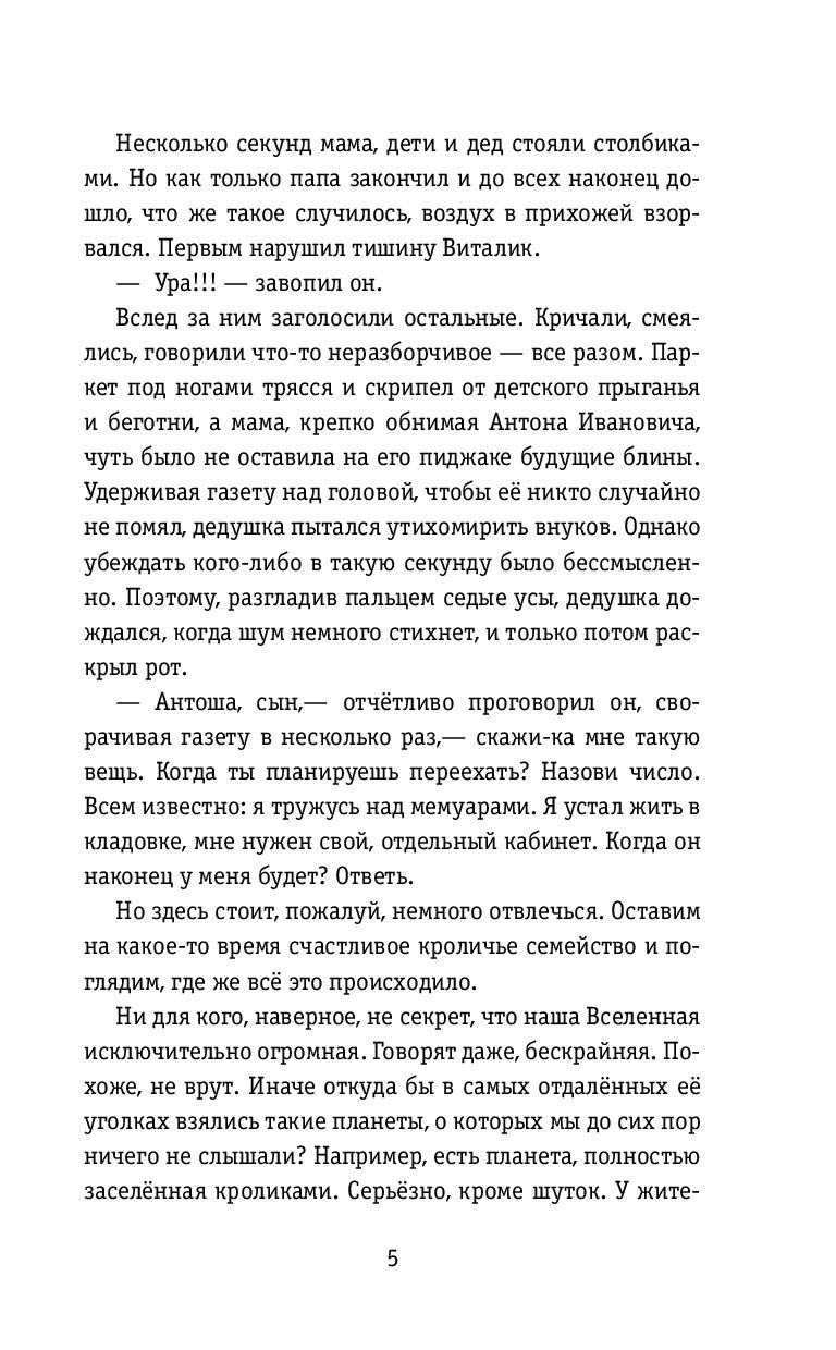В дальнем уголке Вселенной существует планета, населённая кроликами. Их цивилизация во многом схожа с нашей. У них даже имена такие привычные и родные. Например, главу семейства Кроликов (такая фамилия) зовут Антоном Ивановичем; его супруга – Светлана Сергеевна. У них пара крольчат: ученица пятого класса Аня и её младший брат Виталик.