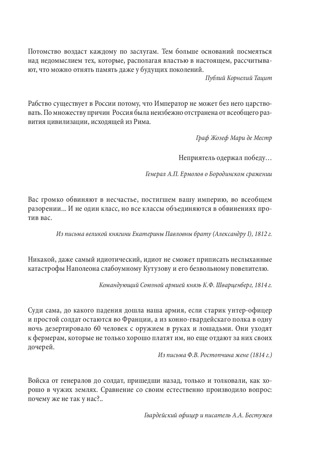 Перед вами – уникальная книга: подлинная история войны 1812 года! Крупнейший в России специалист по эпохе Наполеона, известный ученый-историк, Евгений Понасенков, изучил десятки тысяч документов, хранящихся в архивах России и Европы, а также дневники и мемуары участников событий – и сумел создать принципиально новое описание той грандиозной кампании. Безупречная точность научного изложения сочетается с яркой и элегантной манерой подачи материала. Впервые дано подробнейшее описание жизни всех слоев русского общества, исследованы экономические, дипломатические и культурные аспекты произошедшего. Вы узнаете об истинных планах и поступках Наполеона и Александра I, о произошедшей параллельно с вторжением гражданской войне в России, о закулисных "боях" и интригах мира профессиональных ученых и государственной пропаганды.