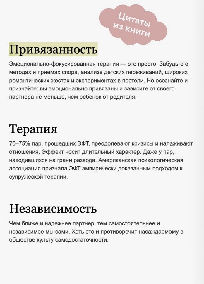 Её автор – Сью Джонсон – вместе со своим научным руководителем разработала новый подход к терапии в парах – эмоционально-фокусированную терапию (ЭФТ).
