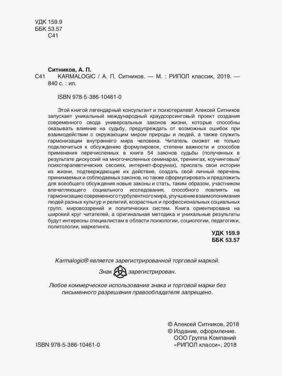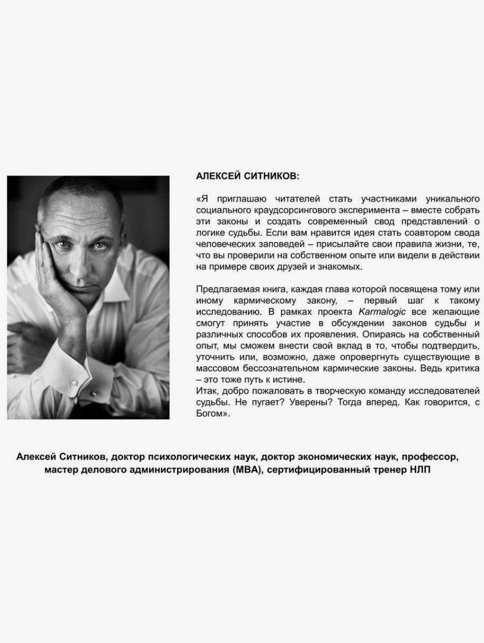 Этой книгой легендарный консультант и психотерапевт Алексей Ситников запускает уникальный международный краудсорсинговый проект создания современного свода универсальных законов жизни, которые способны оказывать влияние на судьбу, предупреждать от возможных ошибок при взаимодействии с окружающим миром природы и людей, а также служить гармонизации внутреннего мира человека.