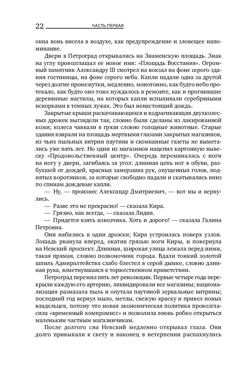 Это первый роман известной американской писательницы русского происхождения. Главная его тема – Человек против Государства, Личное Счастье против Общественного Блага – мастерски проведена через фон драматических событий в жизни Петрограда-Ленинграда начала 20-х годов.