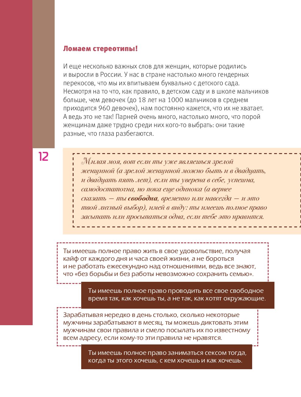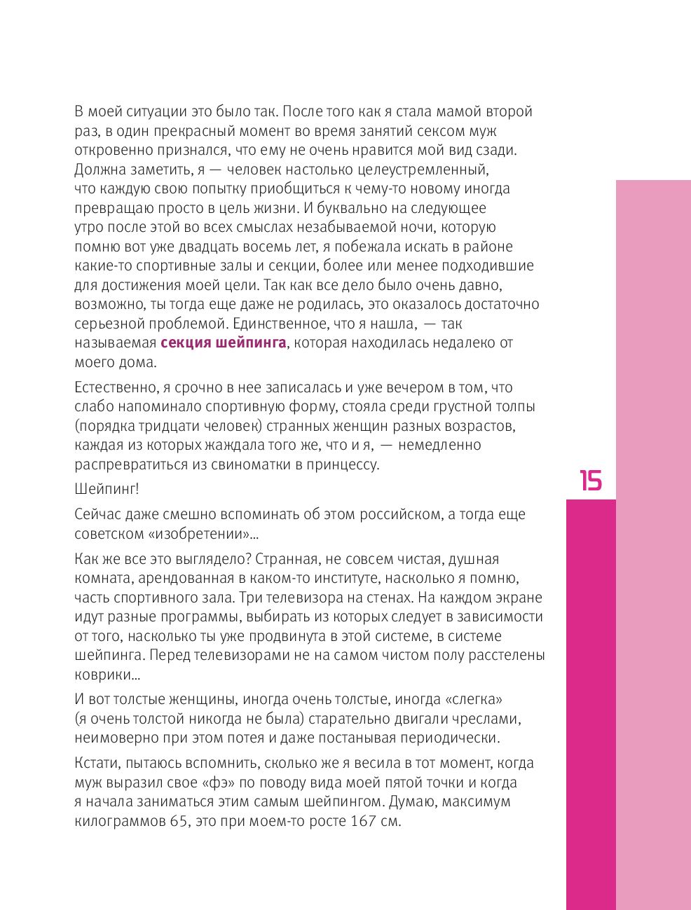 Полезная книга для тех, кто всерьез интересуется фитнесом, а не ходит в зал делать селфи. Я на десяток лет моложе автора, но фигура у меня похуже. Хоть и тренируюсь три раза в неделю уже лет пять. По питанию, тренировкам – вопросов нет, грамотно и толково. За то, что автор написала про фитнес-этикет – отдельное спасибо. Бесят дамочки, которые сидят на тренажерах и строчат в вайбере. Что мне категорически не понравилось, это лирические отступления с пропагандой «свободы и независимости». В книге по ЗОЖ это явно лишнее. Если мне понадобятся советы по отношениям, я почитаю книги семейных психологов, а не измышления женщины, «заказавшей» мужа киллеру из-за парочки московских квартир. К счастью, лирики в книге немного. Книгу рекомендую начинающим и тем, кому лень рыться в интернете в поисках полезной информации. Здесь уже все собрали и понятно изложили. Я ленивая, мне пригодилась :)