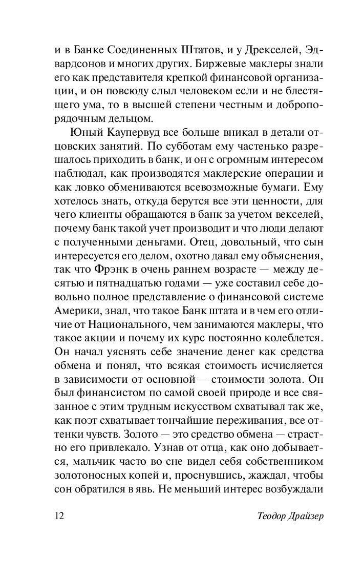 Главный герой, Фрэнк Каупервуд, разбогател всего за несколько дней. Во многом благодаря своей удивительной интуиции. Поначалу перед нами обычный паренек из маленького провинциального городка. Но шаг за шагом Драйзер показывает, как окружающая среда формирует у Фрэнка психологию коммерсанта и биржевого игрока. Он попадает в мир роскоши и больших денег, оказывается в круговороте крупнейших финансовых операций, вращается в обществе лучших дельцов своего времени. Постепенно амбициозный юноша превращается в беспринципного, властного и жаждущего наживы миллионера.