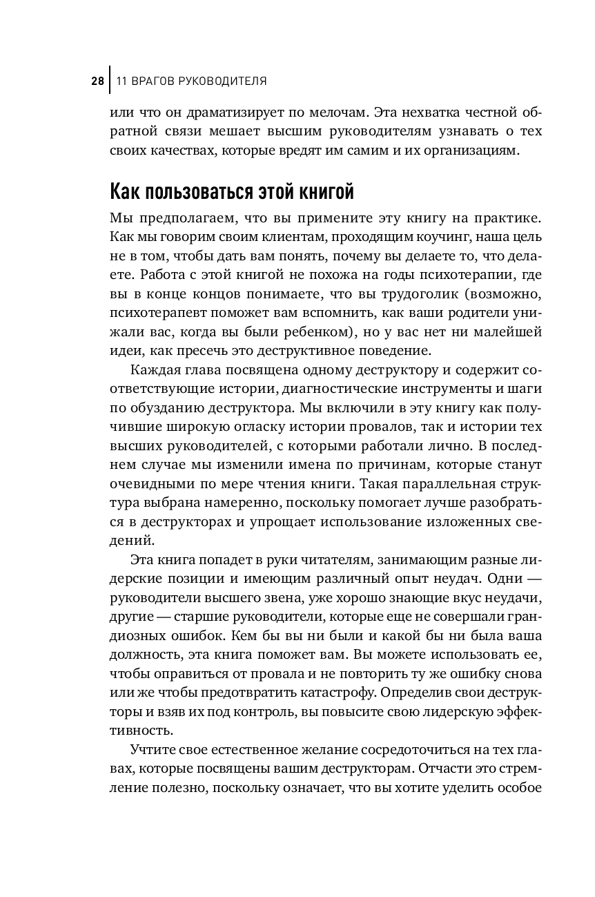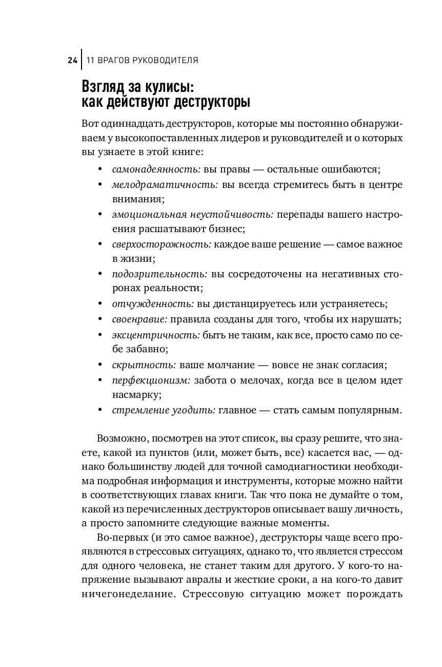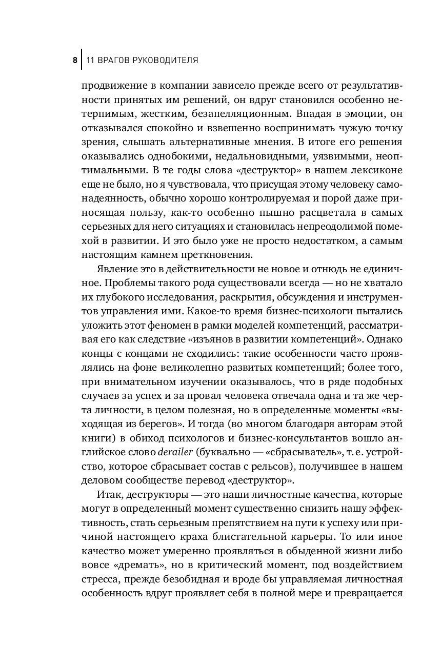 Она посвящена деструкторам – сильным сторонам руководителя, вышедшим из под контроля. Каждое из этих качеств в определенной степени является полезным, а иногда даже необходимым, чтобы добиться успеха. Однако в стрессовых ситуациях они могут неудержимо набирать силу, серьезно подрывая эффективность руководителя и порой приводя к катастрофическим последствиям.