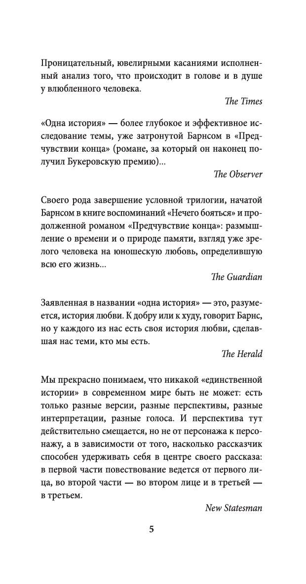 "Одна история" – это "проницательный, ювелирными касаниями исполненный анализ того, что происходит в голове и в душе у влюбленного человека" (The Times); это "более глубокое и эффективное исследование темы, уже затронутой Барнсом в "Предчувствии конца" – романе, за который он наконец получил Букеровскую премию" (The Observer).
