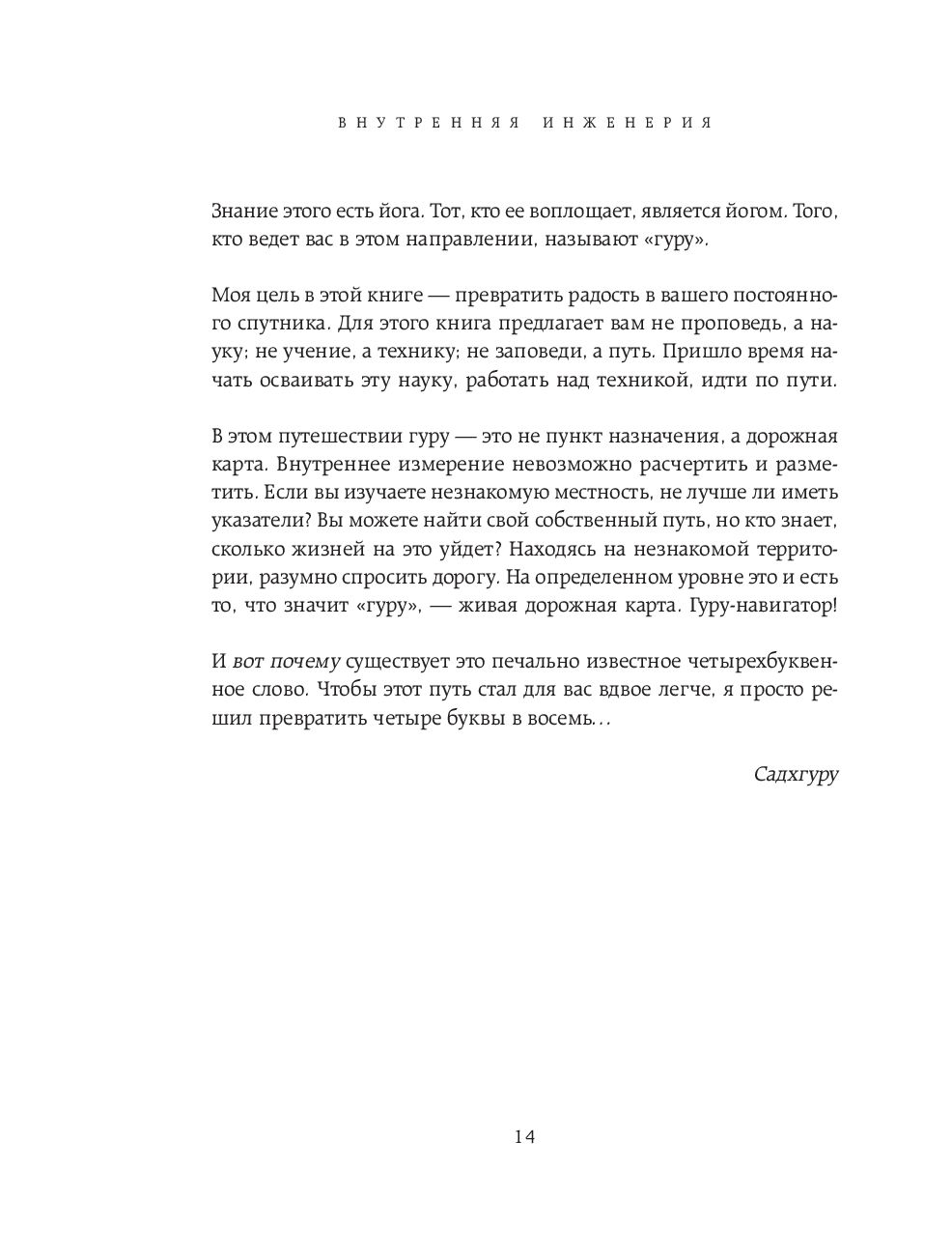Человек – самый сложный механизм на планете, а йога – инструкция по его применению. Так считает Садхгуру – йог, мистик и коуч ведущих компаний мира. Эта увлекательная книга основана на разработанной им системе "Внутренняя инженерия", призванной убрать с йоги культурные наслоения и представить ее как технологию достижения радости и благополучия, доступную любому человеку. Руководствуясь этой древней мудростью, поданной в современном ключе, каждый может сделать свою жизнь именно такой, какой хочет.