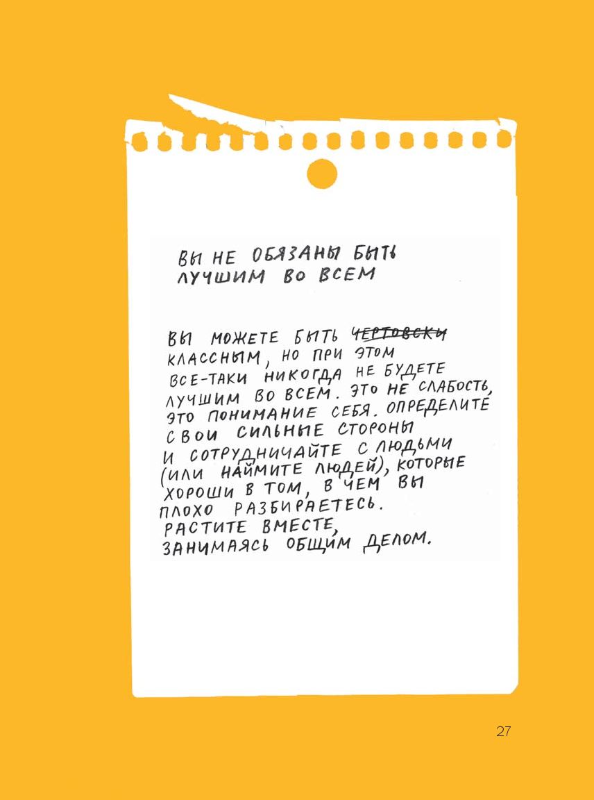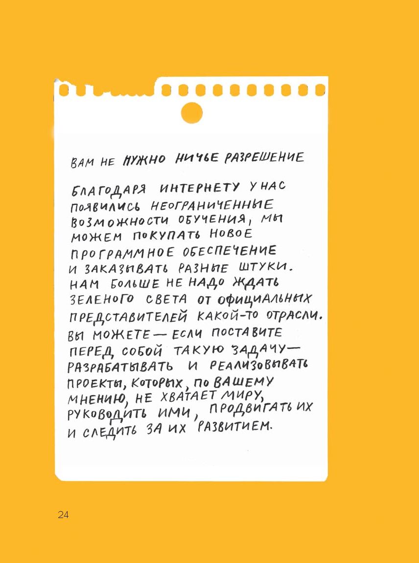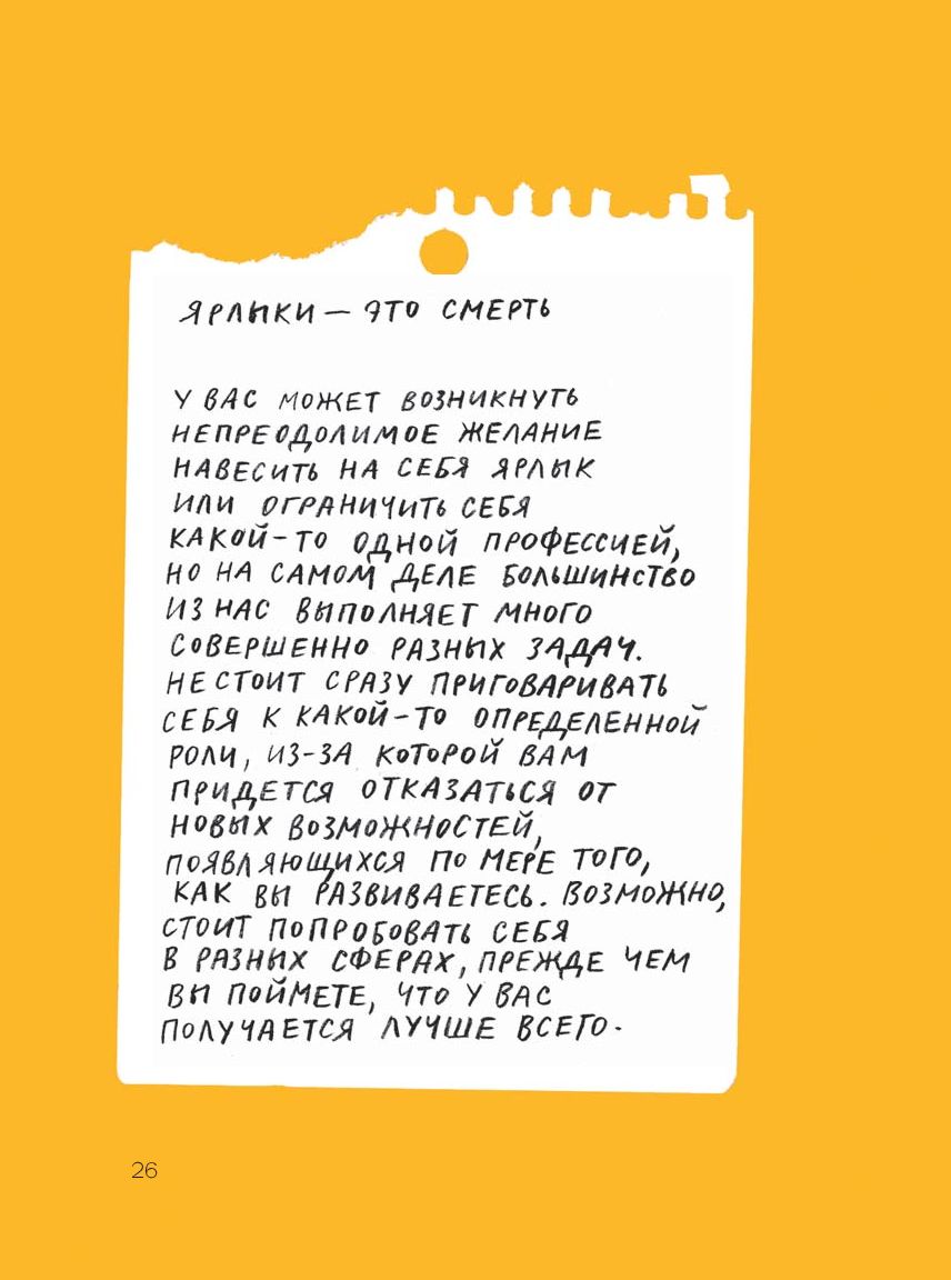 Эта книга – оптимистический призыв дизайнера Адама Куртца ко всем, кто имеет отношение к творчеству. Эта проникновенная книга написана от руки легким и дружелюбным стилем и наполнена жизненными советами, которые помогут на разных этапах работы. Самые важные памятки вы можете вырезать и разместить, где захотите, или передать советы кому-то, кто в них нуждается.