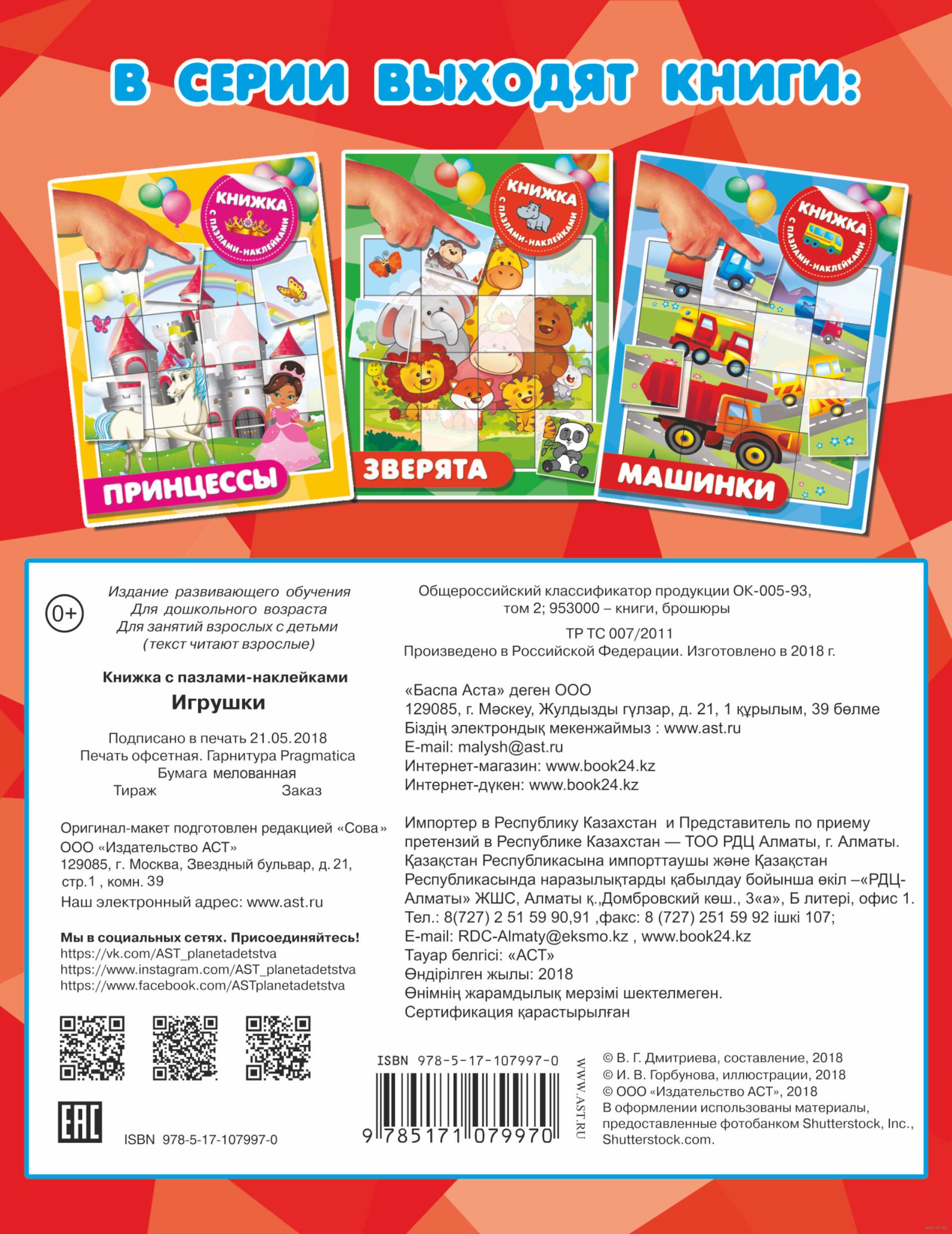"Игрушки" – прекрасно иллюстрированная интерактивная книжка для развития речи, памяти, внимания, воображения и мелкой моторики + 80 красочных стикеров. Играть с многоразовыми наклейками интересно, познавательно, полезно. Любознательные малыши с удовольствием послушают и отгадают загадки, а также смогут сами дополнить сюжетные рисунки стикерами. Не беда, если сложить картинку с первого раза не получается, ведь стикеры можно приклеивать на страницы книги много-много раз.