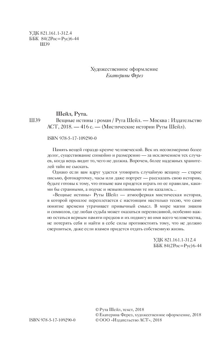 "Вещные истины" Руты Шейл – атмосферная мистическая история, в которой прошлое переплетается с настоящим настолько тесно, что само понятие времени утрачивает привычный смысл. В мире магии знаков и символов, где любая судьба может оказаться переписанной, особенно важно остаться верным памяти предков и их подвигу во имя всего человечества, не потерять себя и найти в себе силы противостоять тому, что не должно свершиться, даже если взамен придётся отдать собственную жизнь.