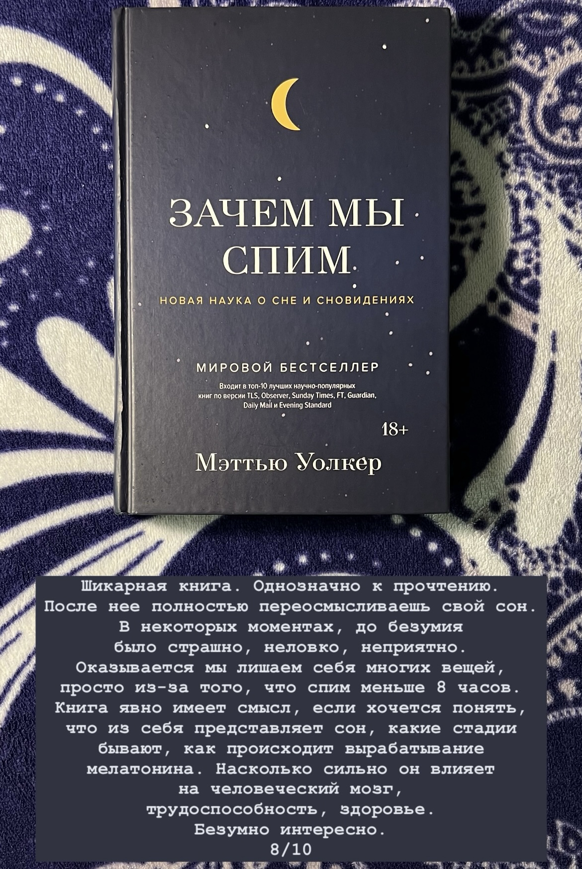 Потрясающая книга! Доступным языком изложены результаты многолетних исследований о "простом" сне. Интересно и легко читается, многие вещи сразу себе в заметки. Номер 1 в моем рейтинге книг о здоровье. Книга must read!