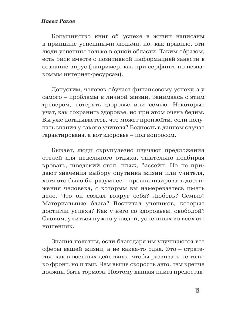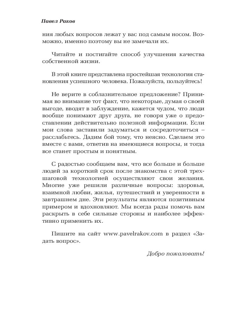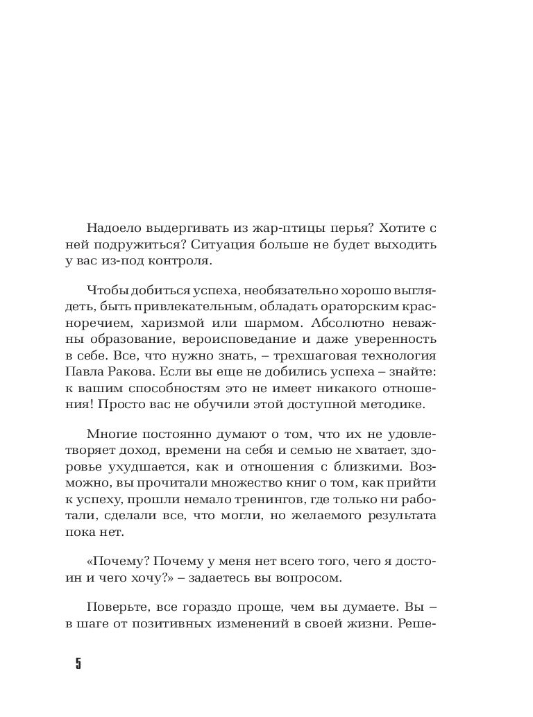 Чтобы добиться успеха, не обязательно хорошо выглядеть, быть привлекательным, обладать ораторским красноречием, харизмой или шармом. Абсолютно не важны образование, вероисповедание и даже уверенность в себе. Все, что нужно знать, – трехшаговая технология Павла Ракова. Если вы еще не добились успеха – знайте: к вашим способностям это не имеет никакого отношения! Просто вас не обучили этой доступной методике. Павел Раков точно знает, как получить то, что хочешь. Прочитав эту книгу, вы, наконец, поймаете свою птицу удачи, и жизнь больше никогда не будет выходить у вас из-под контроля.