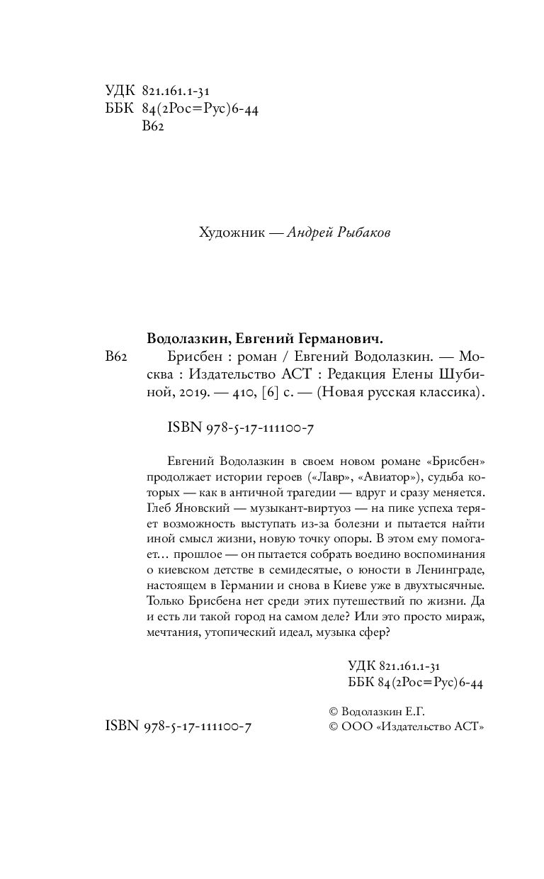 Евгений Водолазкин – лауреат премий "Большая книга" и "Ясная Поляна". В романе "Брисбен" он продолжает истории героев ("Лавр", "Авиатор"), судьба которых – как в античной трагедии – вдруг и сразу меняется. Глеб Яновский – музыкант-виртуоз – на пике успеха теряет возможность выступать из-за болезни и пытается найти иной смысл жизни, новую точку опоры. В этом ему помогает... прошлое – он пытается собрать воедино воспоминания о киевском детстве в семидесятые, о юности в Ленинграде, настоящем в Германии и снова в Киеве уже в двухтысячные.