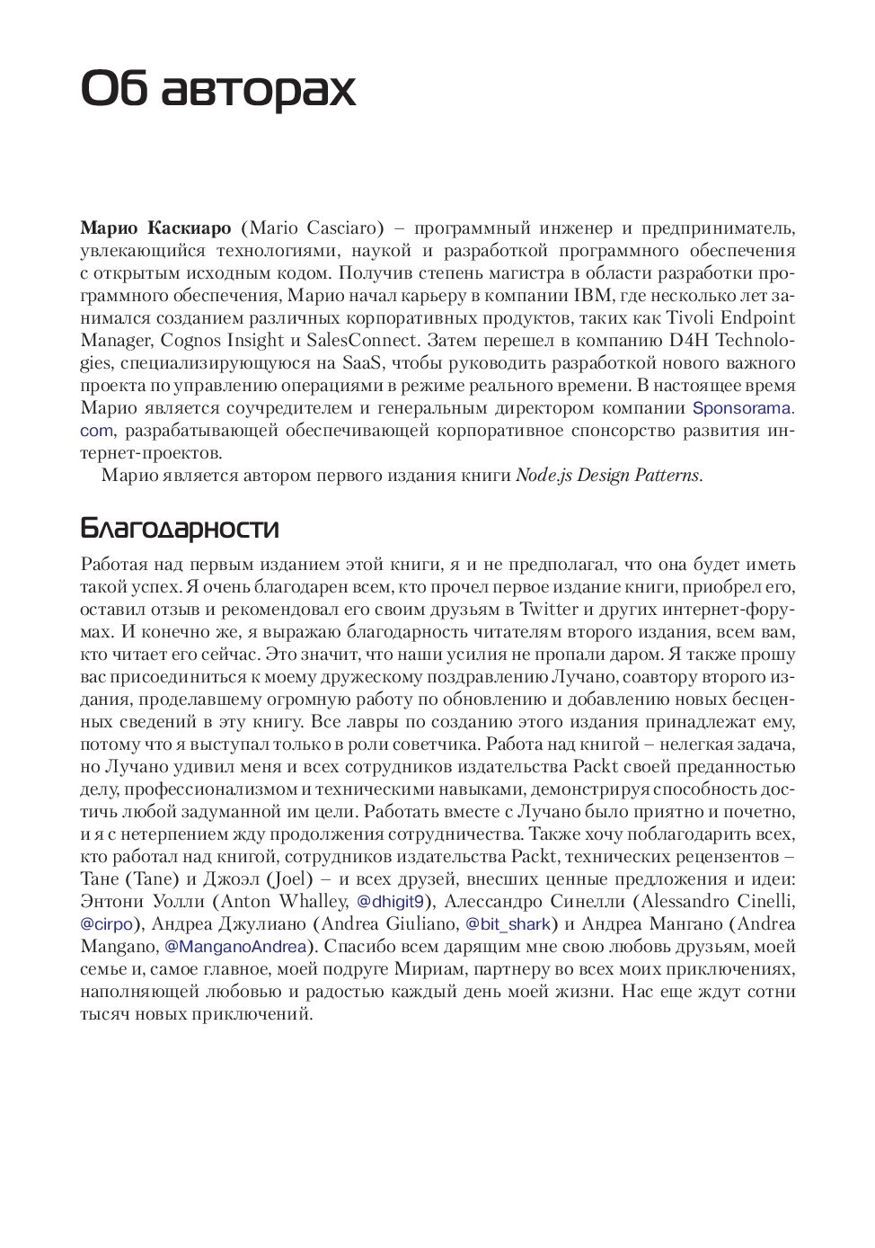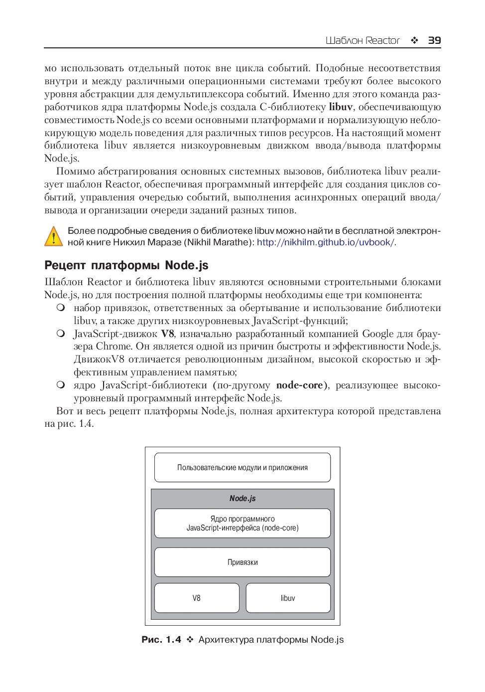В книге описаны асинхронная, однопоточная архитектура платформы, а также шаблоны асинхронного управления потоком выполнения и потоками данных. Рассмотрен подробный список реализаций распространенных, а также некоторых уникальных шаблонов проектирования в Node.js.