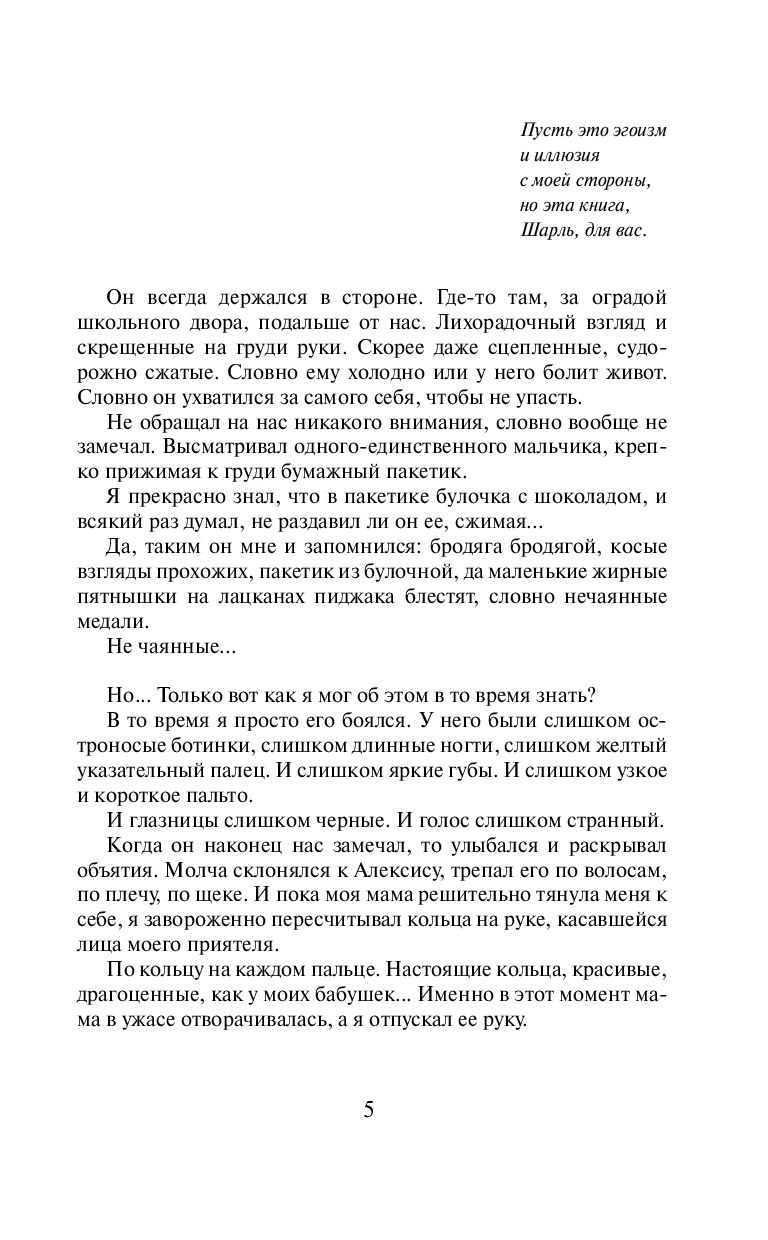 Шарль Баланда – преуспевающий архитектор сорока шести лет. Живет в Париже с любимой женщиной – красавицей Лоранс – и ее дочерью Матильдой. Много работает, редко бывает дома, всего добился собственным трудом, спокойный, рассудительный, кирпичик за кирпичиком выстраивает и обустраивает свою жизнь. В общем-то все у него как положено, да и сюрпризов в таком возрасте ждать не приходится. Но однажды он получит письмо, которое застигнет его врасплох. Письмо из прошлого, о котором он и думать забыл, и как же далеко оно уведет его с проторенного пути...