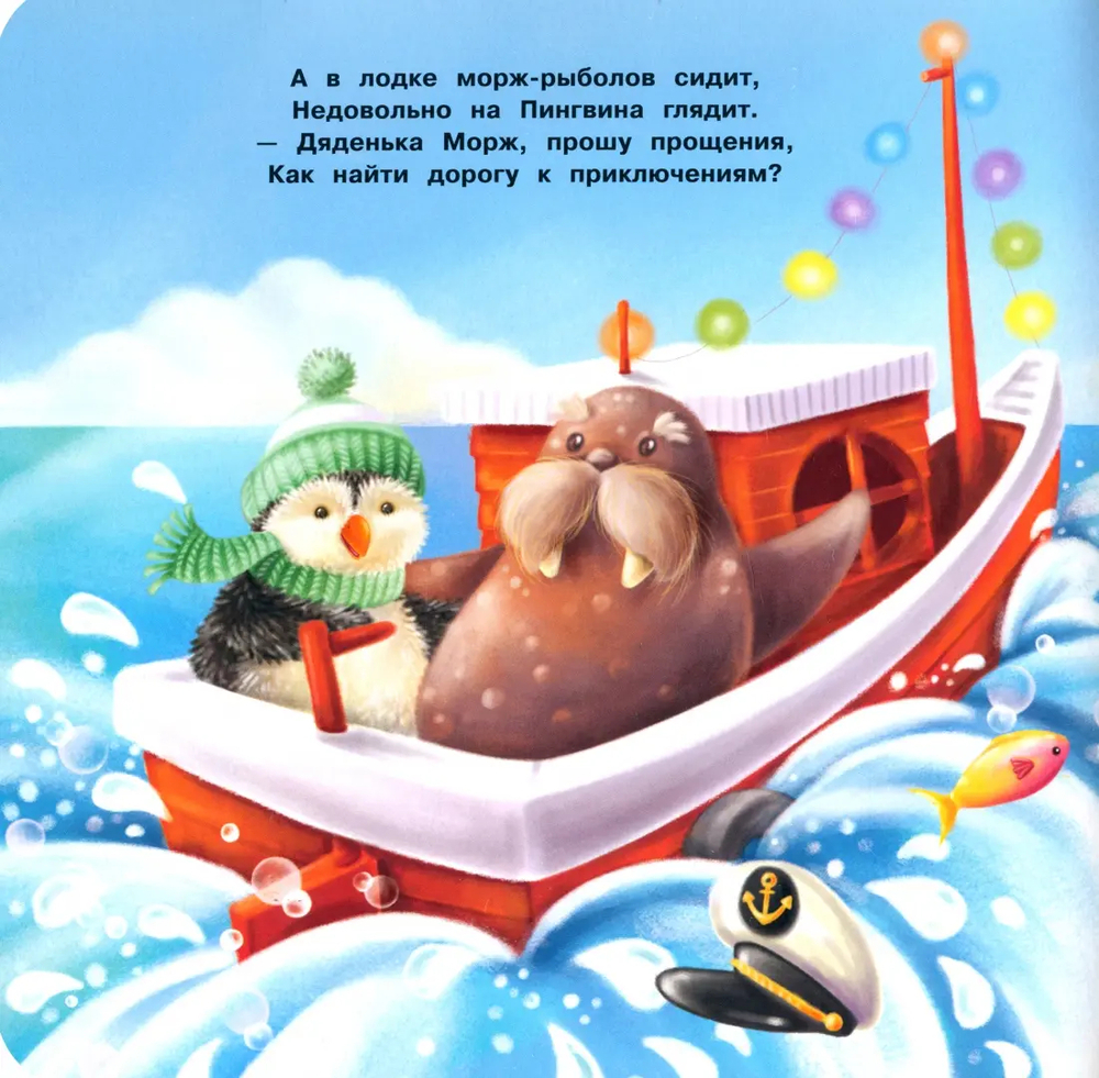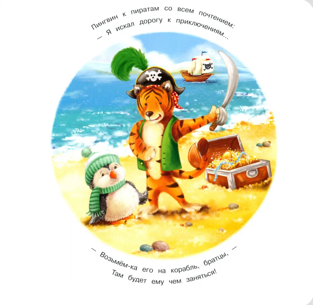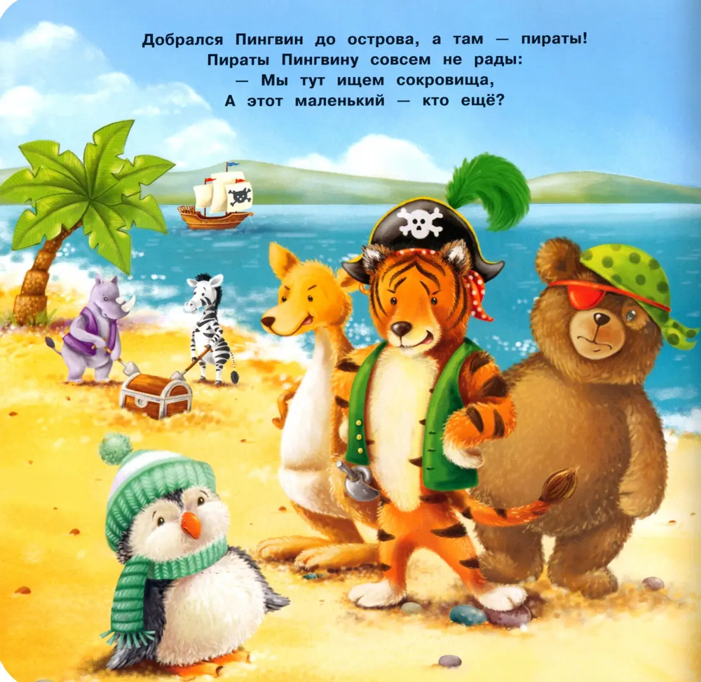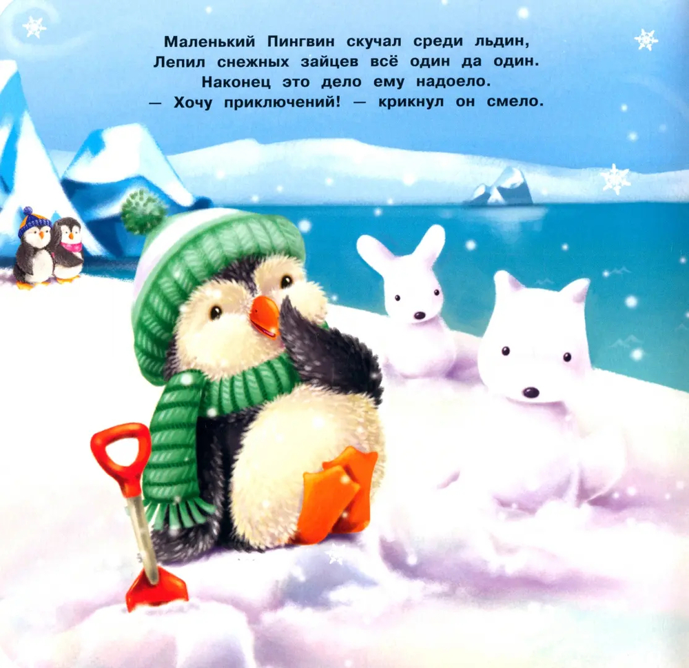 Маленький Пингвин так старался найти приключения! Он побывал в тропическом лесу и на дне океана, плавал с пиратами, познакомился с добрым китом, еле унес ноги от свирепого льва – и что же? Понял, что самое главное в любом приключении – дорога домой, к маме.