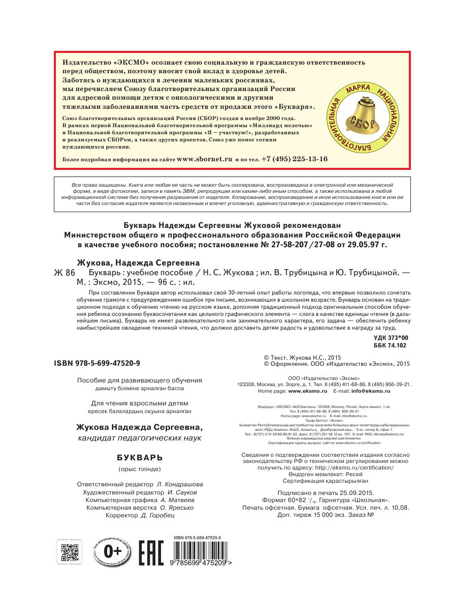 Просто замечательный учебник - книга. Обучала чтению сына именно по ней. Мальчик не очень любил учебные процессы, а с этим букварем ничего. Причем сроки обучения были очень сжатыми, за 2 месяца. Просто сначала нам сказали, что не обязательно, чтобы ребенок умел читать, когда идет в школу, а потом сказали, что должен уметь. В книге все доступно и понятно, как родителям, так и детям. Хорошие иллюстрации, отличный шрифт. Самое главное, что обучение проходило легко, в игровой форме. Теперь этот букварь ждет младшего сына, только его начну учить гораздо раньше и без спешки. На мой взгляд, с трех лет вполне можно обучать чтению именно по этому букварю. Те мамы, кому я рекомендовала эту книгу, тоже были довольны результатом. Искренне благодарна Надежде Жуковой - автору книги, за облегчение обучения ребенка. Не часто встретишь такую правильную обучающую литературу.