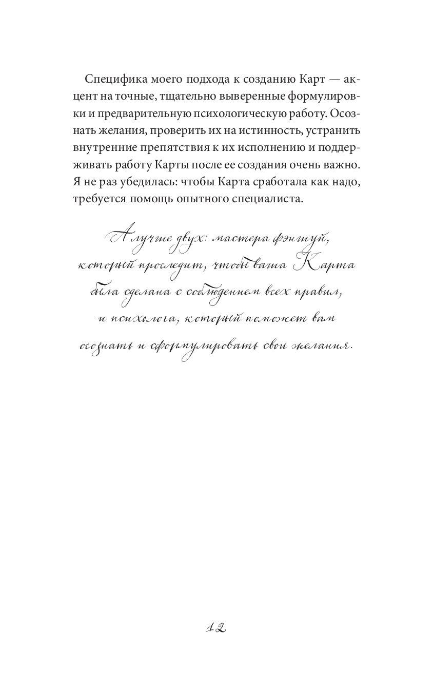 Эта книга содержит четкий пошаговый план, следуя которому каждый может разобраться в своих желаниях, сформулировать их и составить собственную Карту. В книге есть примеры формулировок желаний, подробные инструкции по изготовлению Карты, примеры иллюстраций, которые помогут визуализировать желания. Попробуйте сделать свою Карту! Подарите себе новую жизнь!