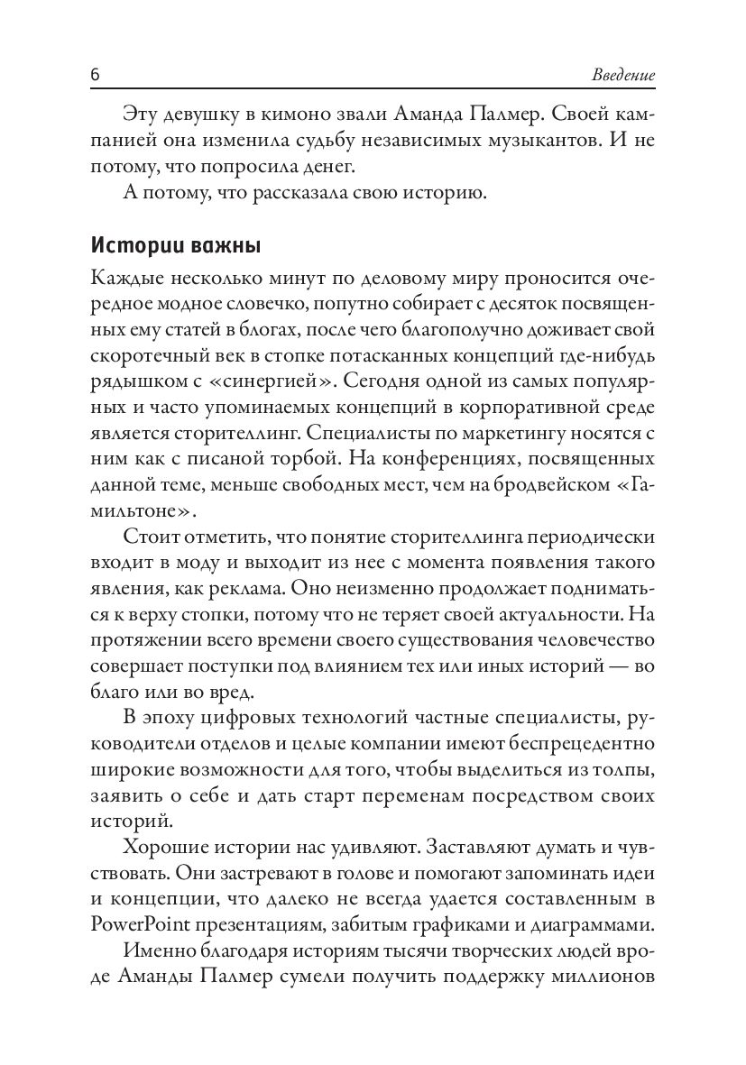 Авторы, опираясь на многолетний опыт, знакомят читателя с нейробиологической механикой сторителлинга, с неожиданными компонентами эффективных историй и с методиками наращивания потребительской аудитории за счёт создания вовлекающего и поддающегося аналитической оценке контента. Вместе с тем они показывают, как руководители могут использовать те же инструменты сторителлинга для формирования более сплочённого и лояльного коллектива внутри своей компании.