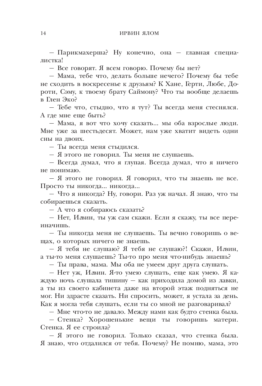 Каждое произведение Ирвина Ялома – это бестселлер. Талант рассказчика ярко виден даже в тех его книгах, которые посвящены специальной тематике. В этой же книге его писательский дар проявляется просто блистательно! Можно без конца слышать, что слово лечит, история учит, но оставаться при этом совершенным скептиком. Но стоит открыть книгу Ялома и прочесть несколько первых строк, и эти истины перестают быть банальными. Автор – замечательный рассказчик, он не только умеет рассказывать, он любит это делать. Беря в руки эту книгу, ты остаешься один на один с автором и становишься не читателем, а скорее слушателем. Ну и, разумеется, учеником, потому что этот рассказчик учит. И когда он говорит: "Слушайте своих пациентов. Позвольте им учить вас", на какой-то миг вы меняетесь местами: ты становишься врачом, а Ялом – твоим пациентом, который учит своего терапевта. Ты только позволь ему это делать.