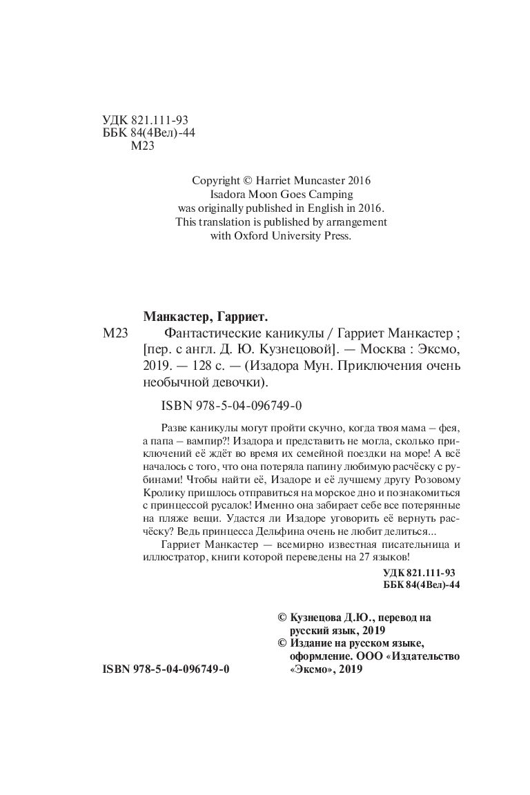 Разве каникулы могут пройти скучно, когда твоя мама – фея, а папа – вампир?! Изадора и представить не могла, сколько приключений её ждёт во время их семейной поездки на море! А всё началось с того, что она потеряла папину любимую расчёску с рубинами! Чтобы найти её, Изадоре и её лучшему другу Розовому Кролику пришлось отправиться на морское дно и познакомиться с принцессой русалок! Именно она забирает себе все потерянные на пляже вещи. Удастся ли Изадоре уговорить её вернуть расчёску? Ведь принцесса Дельфина очень не любит делиться...