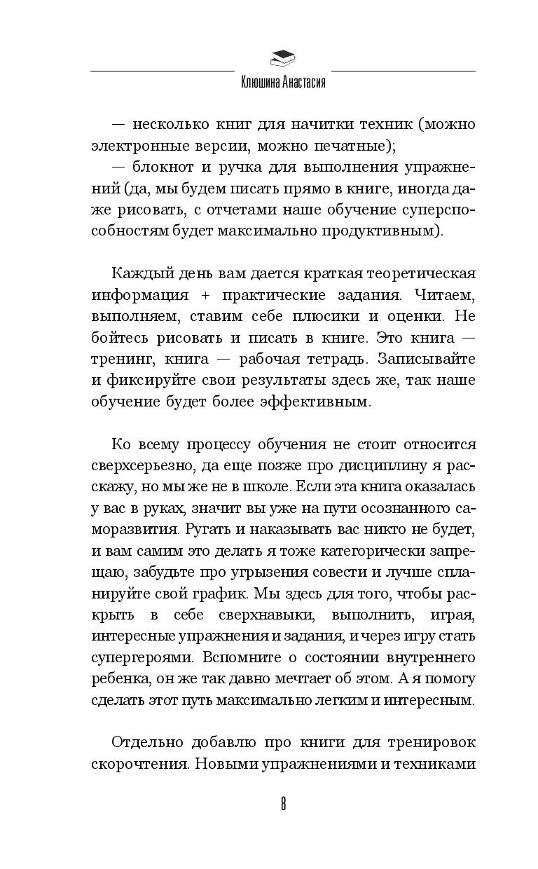 Применив хотя бы 40% знаний, полученных из этой книги, ваша жизнь уже не будет прежней – вы не только увеличите скорость чтения и объем запоминаемого, вы прокачаете свою креативность, внимание и даже эмоциональный интеллект! Вперед в лигу супергероев!