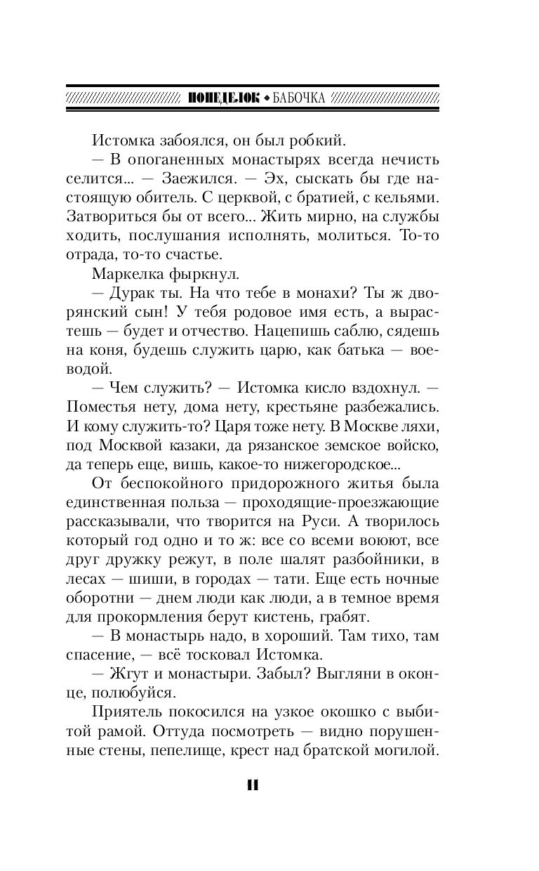 "Он вдруг увидел перед собой всю свою длинную-предлинную жизнь как одну краткую седмицу: с трудоначальным понедельником, юновесенним вторником, мужественной середой, сильным четвертком, зрелой пятницей, грозовой субботой и тихим, светлым воскресеньем..." На нем – вся московская стража, блюдение городского порядка, сыск преступлений. Он расследует злодеяние за злодеянием, а перед глазами читателя между тем проходит не только череда невероятных приключений "старомосковского Шерлока Холмса", но и весь семнадцатый век, с его войнами, лихими разбойниками и знаменитыми бунтами (роман "Седмица Трехглазого").