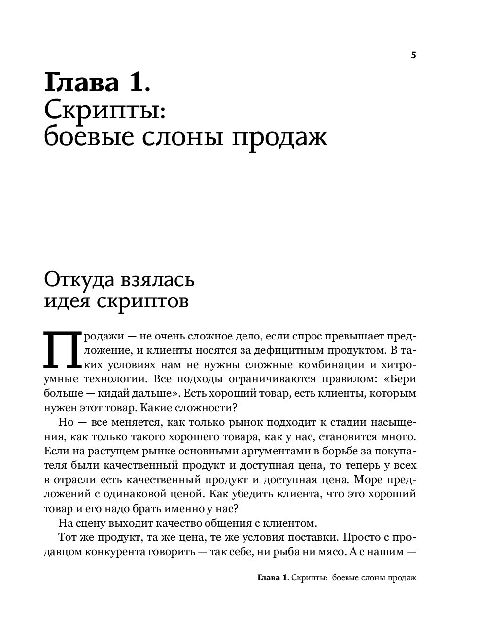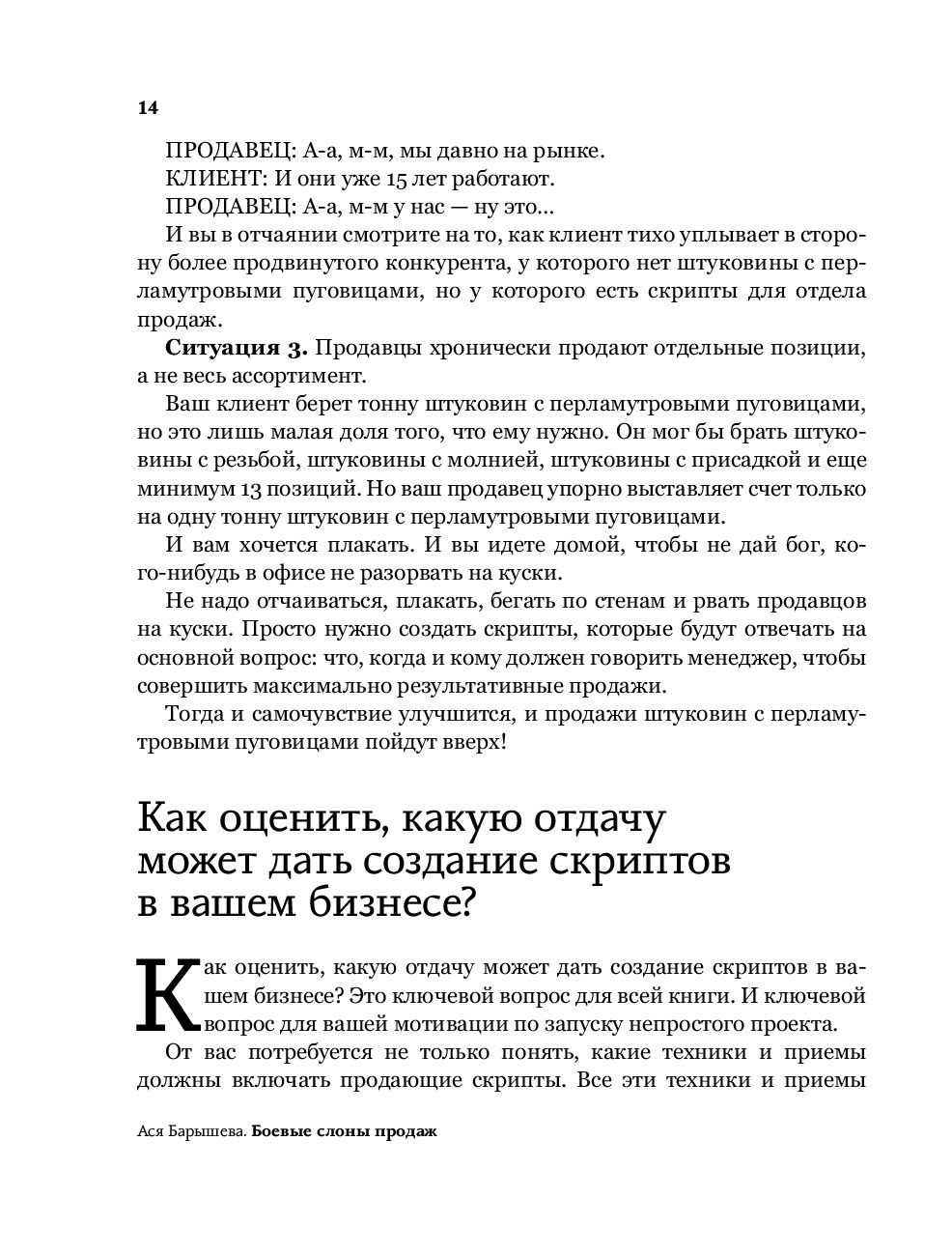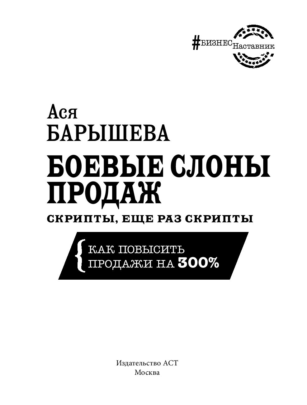 Из «Боевых слонов продаж» вы благодаря ярким примерам и конкретным продающим фразам узнаете, за счет каких механизмов возникает магия скриптов. А также найдете ответы на такие вопросы, как лучше продавать с помощью скриптов и как лучше руководить отделом продаж, используя грамотные скрипты.