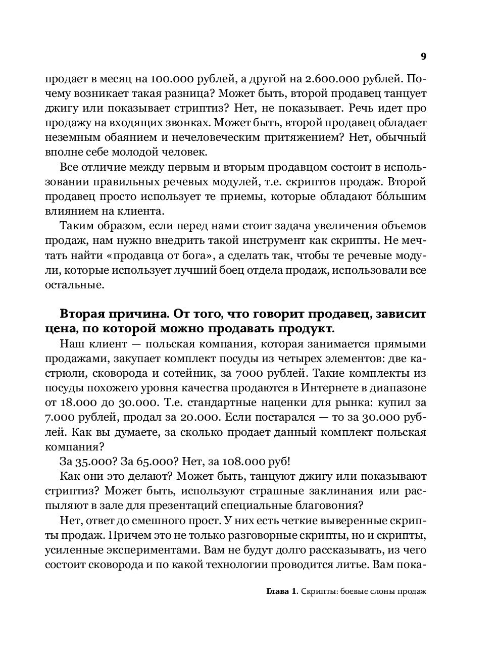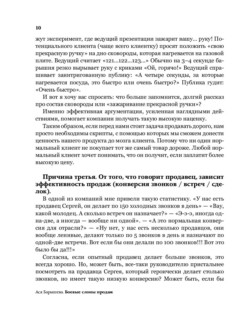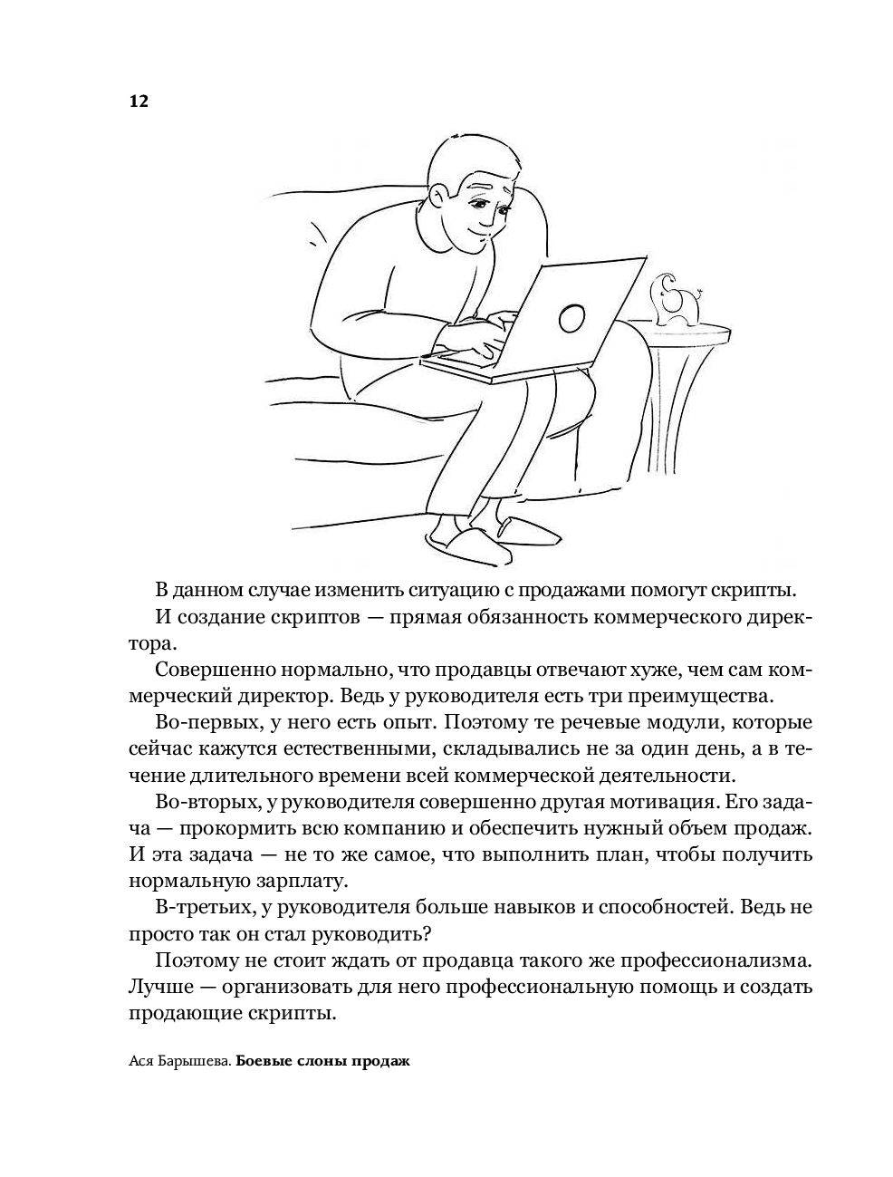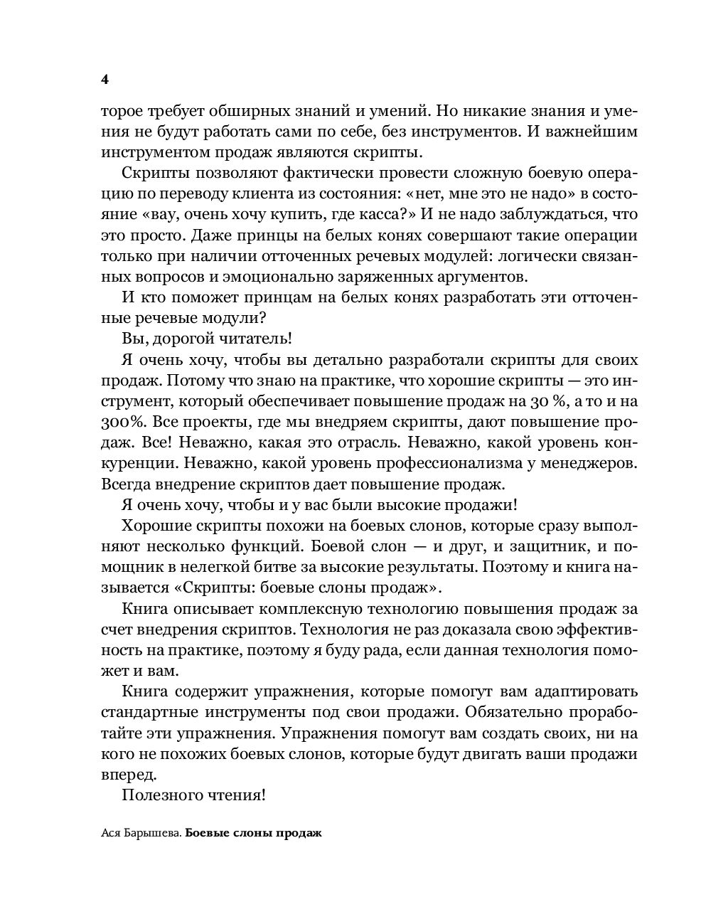 Из «Боевых слонов продаж» вы благодаря ярким примерам и конкретным продающим фразам узнаете, за счет каких механизмов возникает магия скриптов. А также найдете ответы на такие вопросы, как лучше продавать с помощью скриптов и как лучше руководить отделом продаж, используя грамотные скрипты.