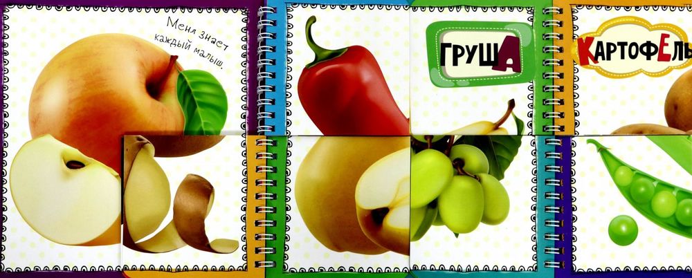 Эти яркие книжки с реалистичными картинками будет не только интересно рассматривать, в них будет полезно играть! Странички из плотного мелованного картона разделены на четыре части и соединены с двух сторон удобными спиралями. Из четырех частей малышу надо будет собрать целую картинку. Можно воспользоваться небольшими текстами-подсказками. Когда на одной стороне все картинки собраны, можно просто закинуть странички назад, перевернуть книгу и начать собирать следующие картинки-пазлы, которых всего в книге 18.
