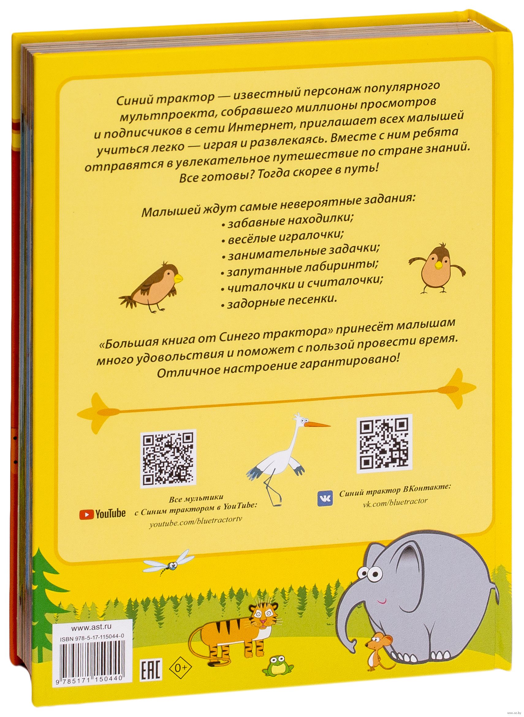 Все малыши в восторге от Синего трактора – главного героя развивающего мультпроекта, популярного в сети Интернет. В этой книге Синий трактор предлагает тебе не только выполнить занимательные задания, но и спеть вместе с ним весёлые песенки. А ещё в ней можно рисовать – для этого здесь есть большие раскраски, которые любят все дети. Счет и алфавит, животные и птицы, овощи и фрукты, лабиринты и задачки – все это и многое другое ждет юных читателей на страницах "Большой книги от Синего трактора".
