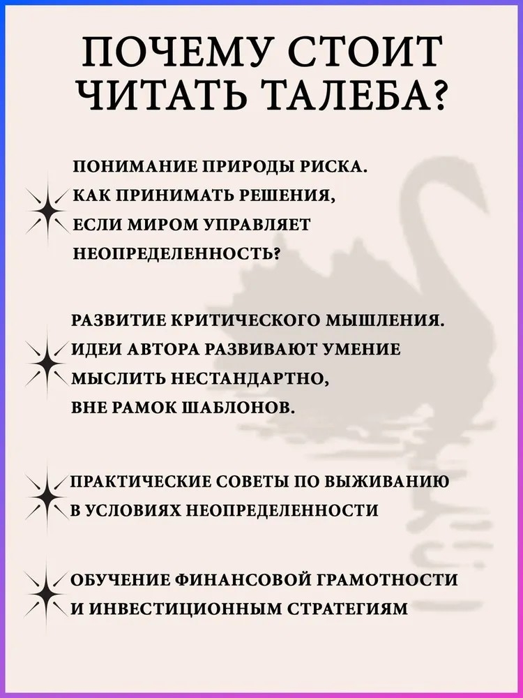Сразу после выхода "Черного лебедя" автор блестяще продемонстрировал свою "не-теорию" на практике: на фоне финансового кризиса компания Талеба заработала (а не потеряла!) для инвесторов полмиллиарда долларов. Но его труд – не учебник по экономике. Это размышления очень незаурядного человека о жизни и о том, как найти в ней свое место. В написанном им позже эссе-постскриптуме "О секретах устойчивости" Талеб дает остроумный отпор тем экономистам-ортодоксам, которые приняли созданное им анти-учение в штыки.