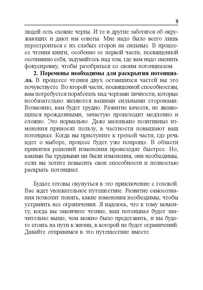 В своей новой книге Джон Максвелл выделяет 17 главных разновидностей потенциала. Какие-то качества даны нам от рождения: энергичность, творческие наклонности, лидерский дух. Другие, например отношение к жизни, характер, целеустремлённость, больше зависят от принимаемых нами решений. Максвелл анализирует все эти виды потенциала и даёт чёткие советы по их развитию. Когда вы устраните любые установленные рамки, ваша жизнь станет гораздо ярче и насыщеннее.