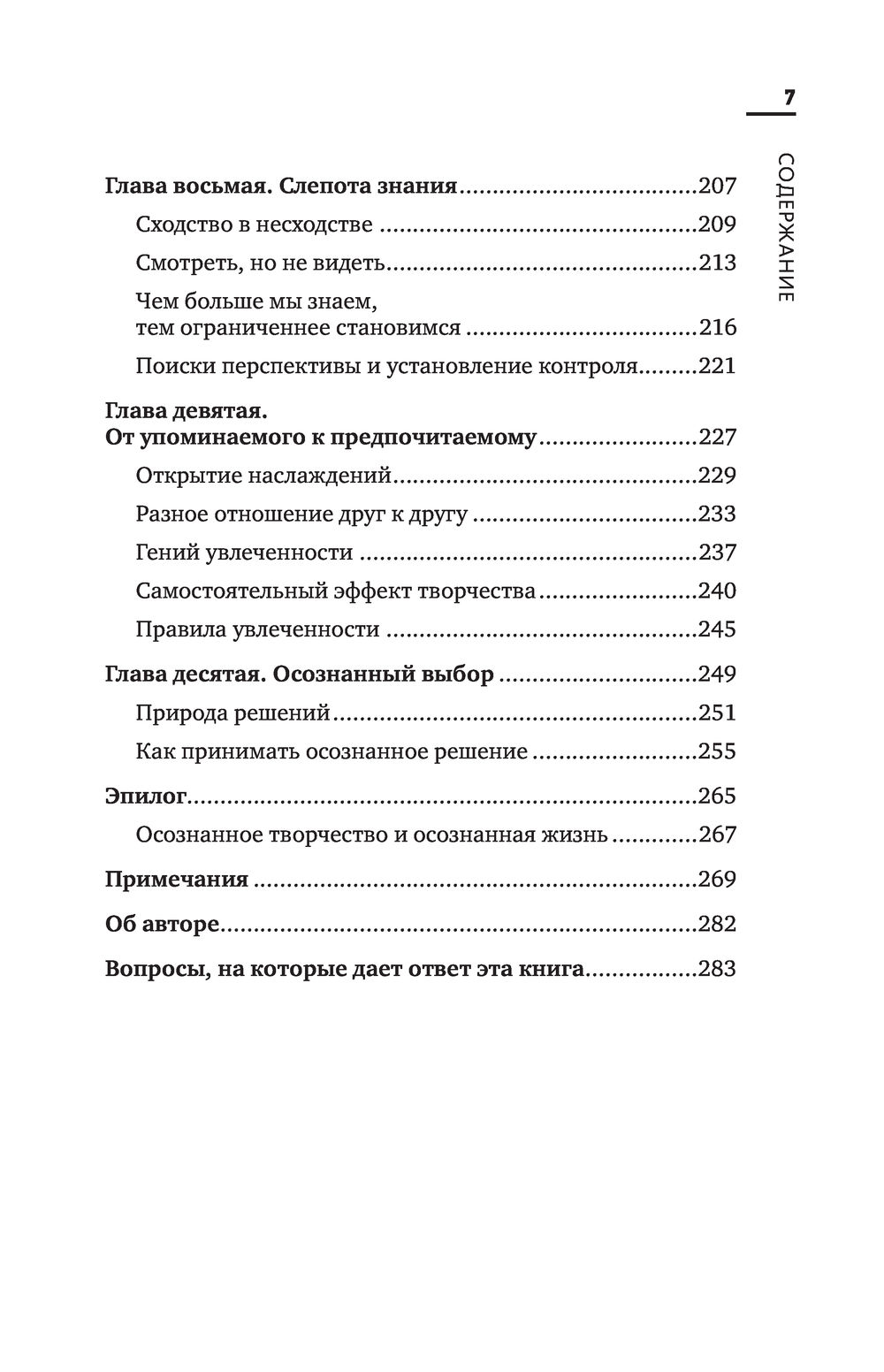 Профессор Гарвардского университета Элен Лангер провела множество экспериментов с участием детей, животных, музыкантов, художников, чтобы проверить свою теорию по осознанности. У музыкантов лучше получается играть "не по нотам", животные чувствуют не только нашу доброту, но и наше присутствие здесь и сейчас, а дети тянутся к тем, кто играет с ними "не по-нарошку". Элен Лангер предлагает своим читателем пройти путь личного ренесанса. И говорит, что его способен одолеть каждый, кто хочет перейти на новый уровень восприятия жизни. Чем мы осознаннее, тем меньше наша неуверенность в себе. Чем внимательнее и бережнее мы относимся к каждой минуте нашей жизни – тем больше бонусов от нее получаем. Эта книга – вдохновляющее руководство для применения творческой мотивации ко всему, что мы делаем. Ее чтение ненавязчиво перестраивает наше мышление, освобождает от пустых оценок и приводит к новым открытиям, которые можно обнаружить в любом рутинном процессе.