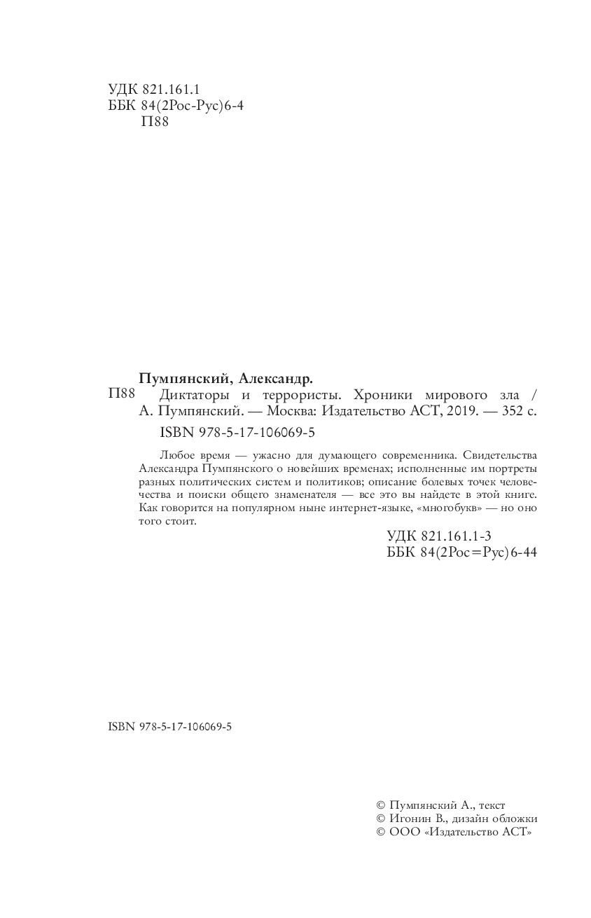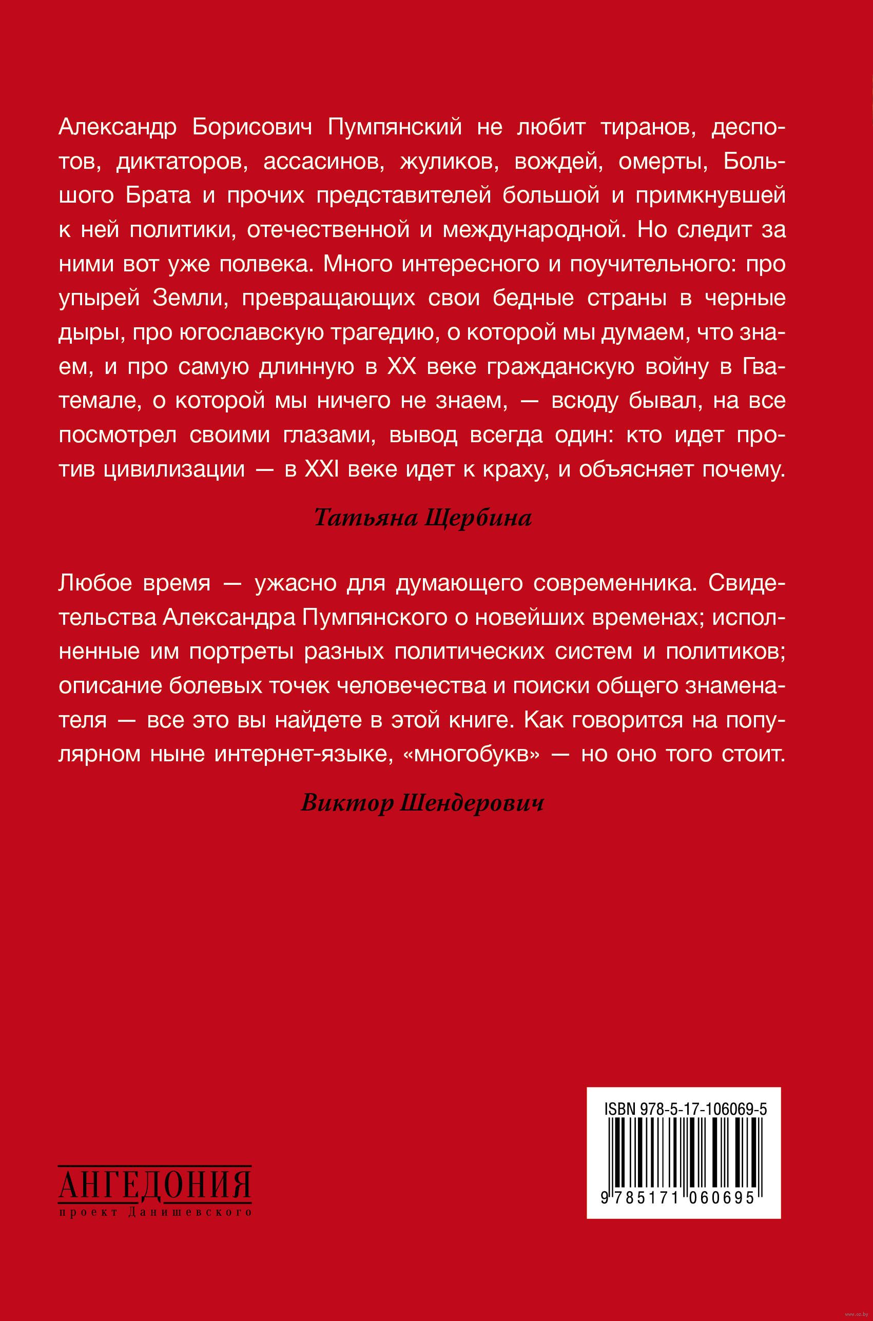 Любое время ужасно для думающего современника. Свидетельства Александра Пумпянского о новейших временах, исполненные им портреты разных политических систем и политиков, описание болевых точек человечества и поиски общего знаменателя – всё это вы найдёте в книге. Как говорится на популярном ныне интернет-языке, "многобукв" – но оно того стоит.