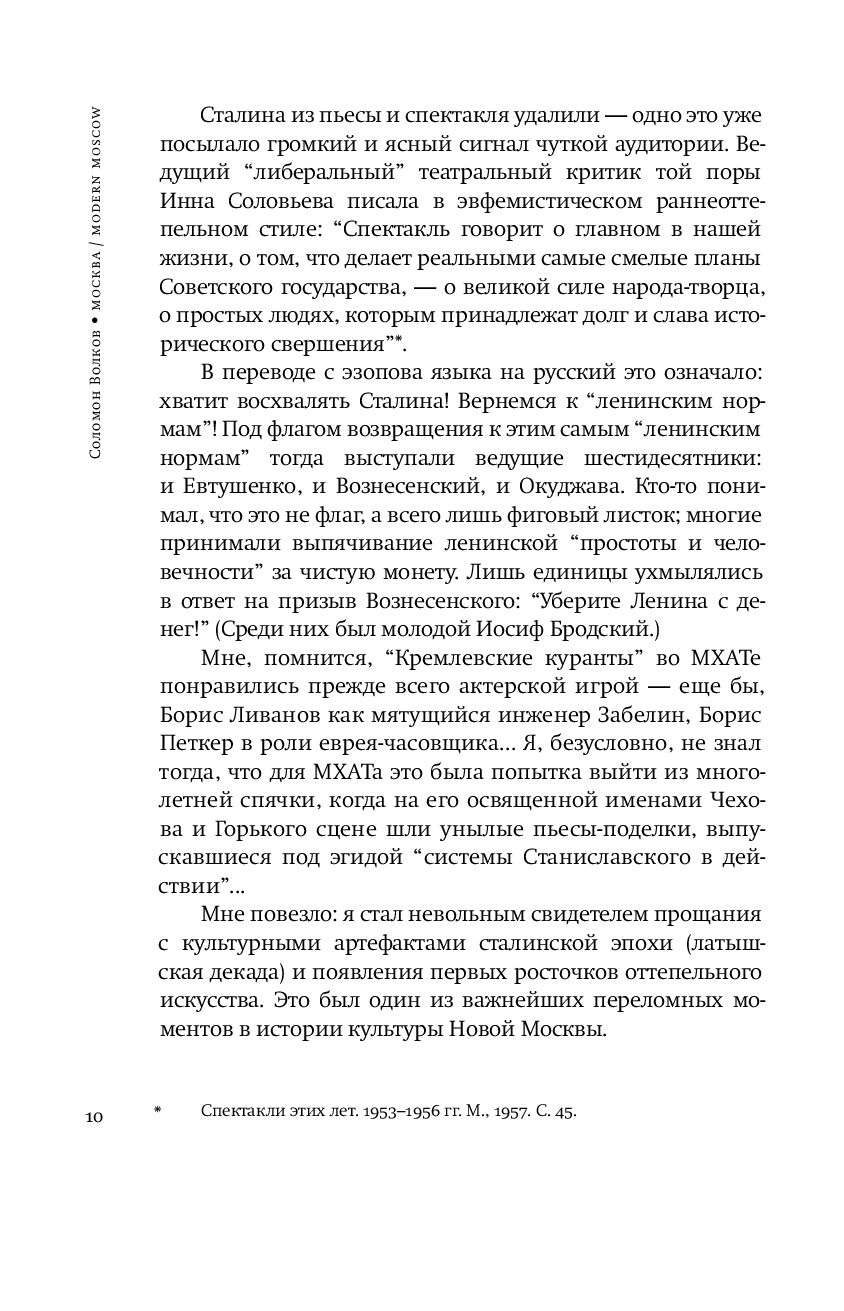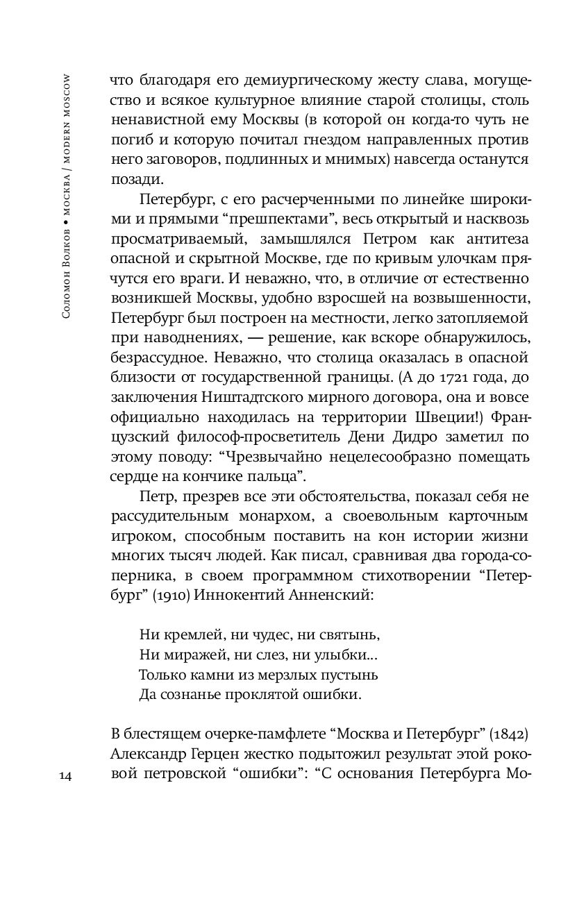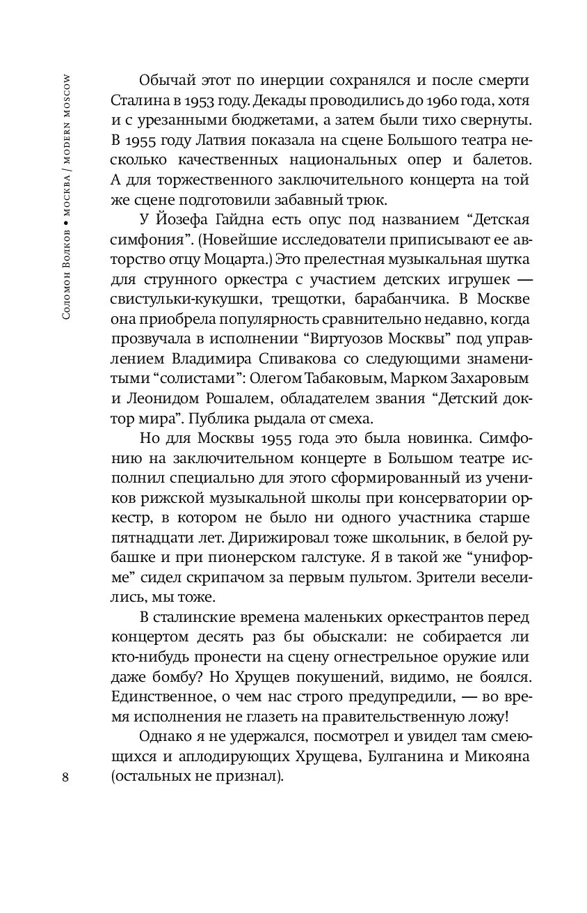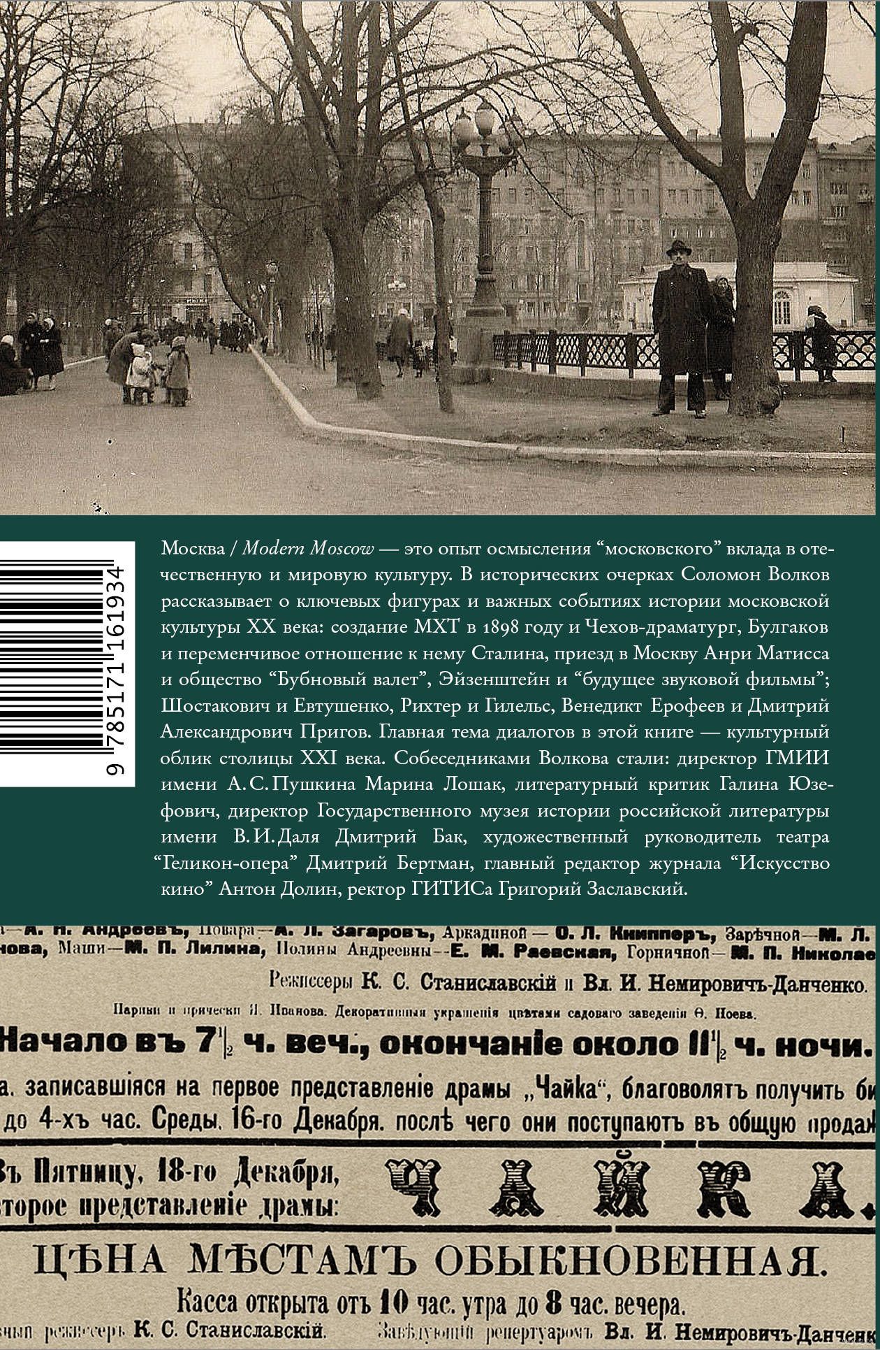 Москва. Modern Moscow – книга уникальная, это первый опыт осмысления "московского" вклада в отечественную и мировую культуру. В исторических очерках Соломон Волков рассказывает о ключевых фигурах и важных событиях истории московской культуры ХХ века: создание МХТ в 1898 году и Чехов-драматург, Булгаков и переменчивое отношение к нему Сталина, приезд в Москву Анри Матисса и общество "Бубновый валет", Эйзенштейн и "будущее звуковой фильмы", Шостакович и Евтушенко, Рихтер и Гилельс, Ерофеев и Д. А. Пригов.