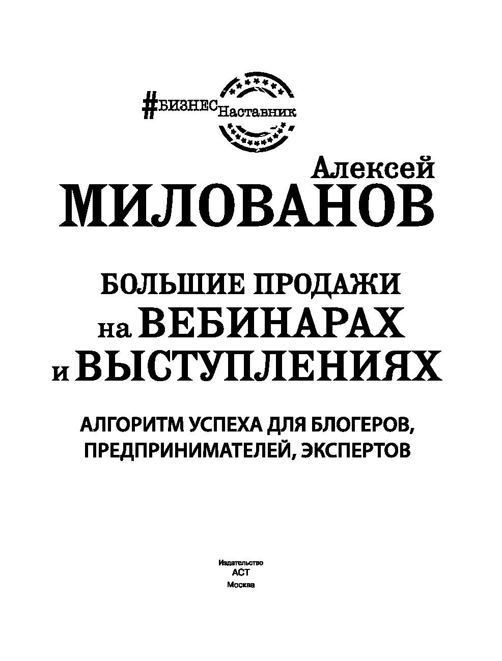 Эта книга – максимально понятный самоучитель по современным техникам продаж. Автор, Алексей Милованов, популярный бизнес-тренер, научит, как увеличить доход и привлечь новых клиентов с помощью вебинаров и выступлений.