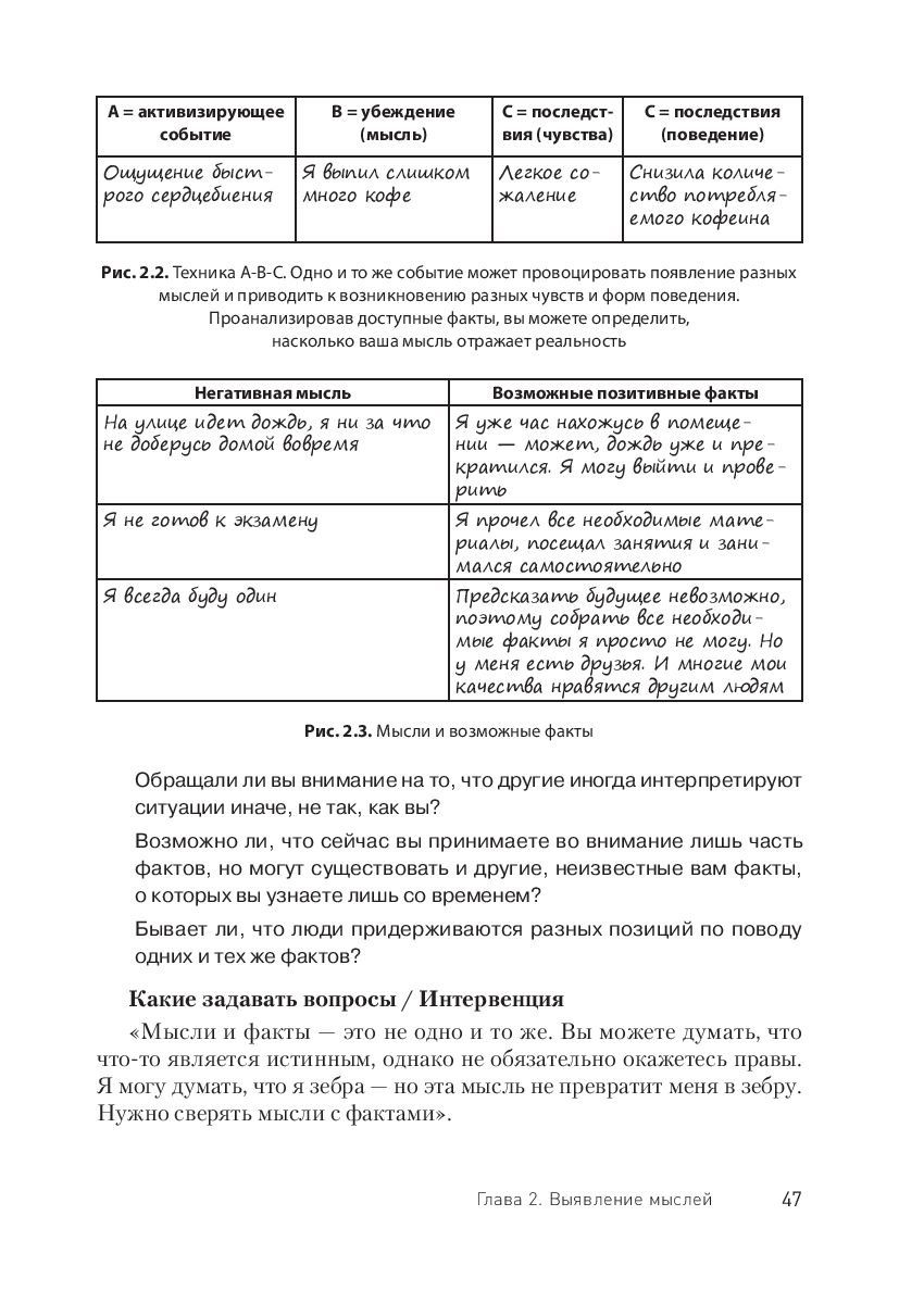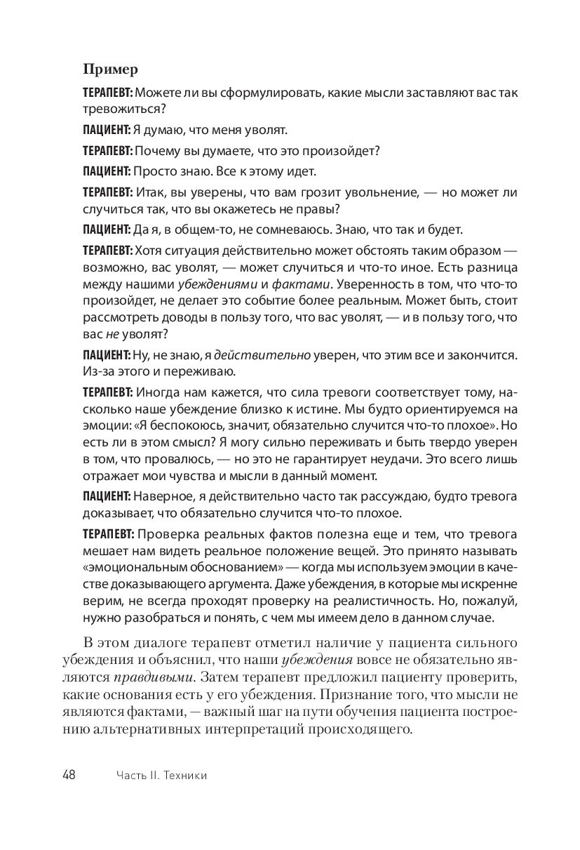 Автор описывает способы помочь клиентам выявить и изменить мысли, провоцирующие создание проблем, основные убеждения, приводящие к тревоге, модели самокритики и поиска одобрения.