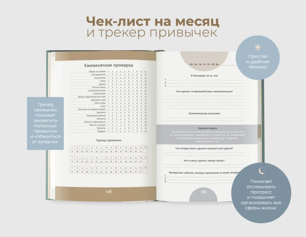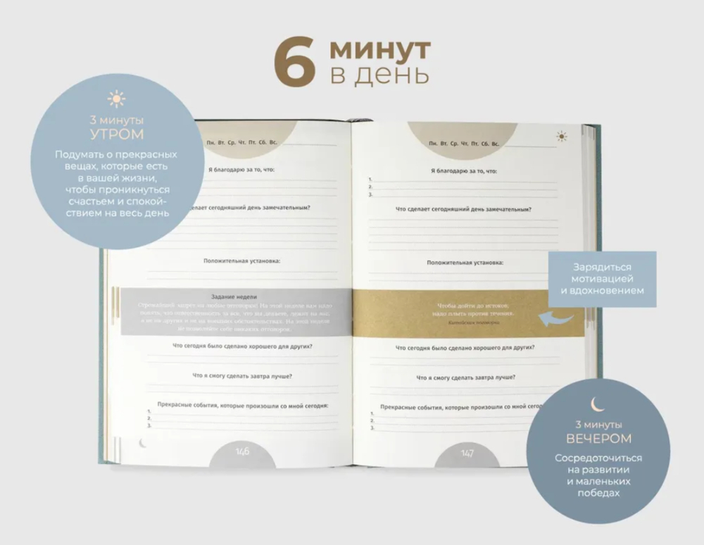 Счастье не является результатом везения или случайного стечения обстоятельств. Стать счастливым помогают правильные установки и образ мыслей. 3 минуты утром и 3 минуты вечером – столько времени займет выработка полезных привычек, которые сделают вашу жизнь осознаннее, гармоничнее, а значит – счастливее. Проверенные на практике принципы позитивной психологии и нейробиологии помогут вам достичь целей, пережить трудные моменты, улучшить отношения с другими людьми и идти по жизни уверенно. С ежедневником вы сможете улучшать свою жизнь постоянно и проактивно, шаг за шагом и каждый день!
