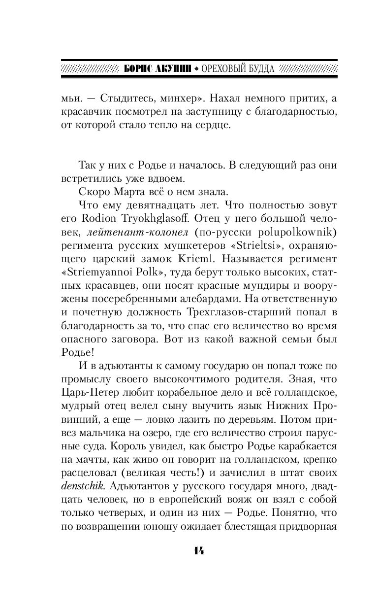 Роман "Ореховый Будда" описывает приключения священной статуэтки, которая по воле случая совершила длинное путешествие из далекой Японии в не менее далекую Московию. Будда странствует по взбудораженной петровскими потрясениями Руси, освещая души светом сатори и помогая путникам найти дорогу к себе...