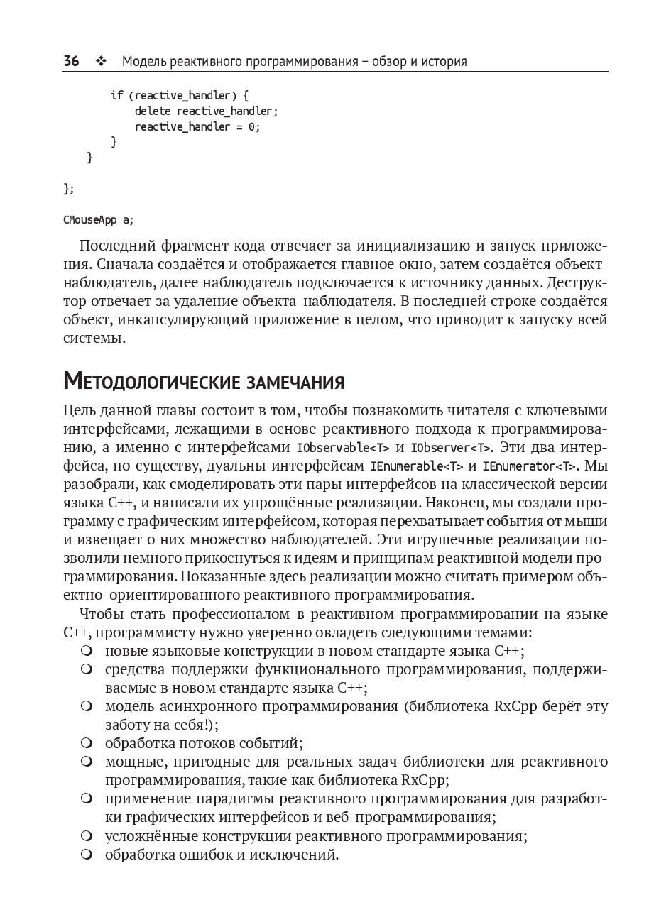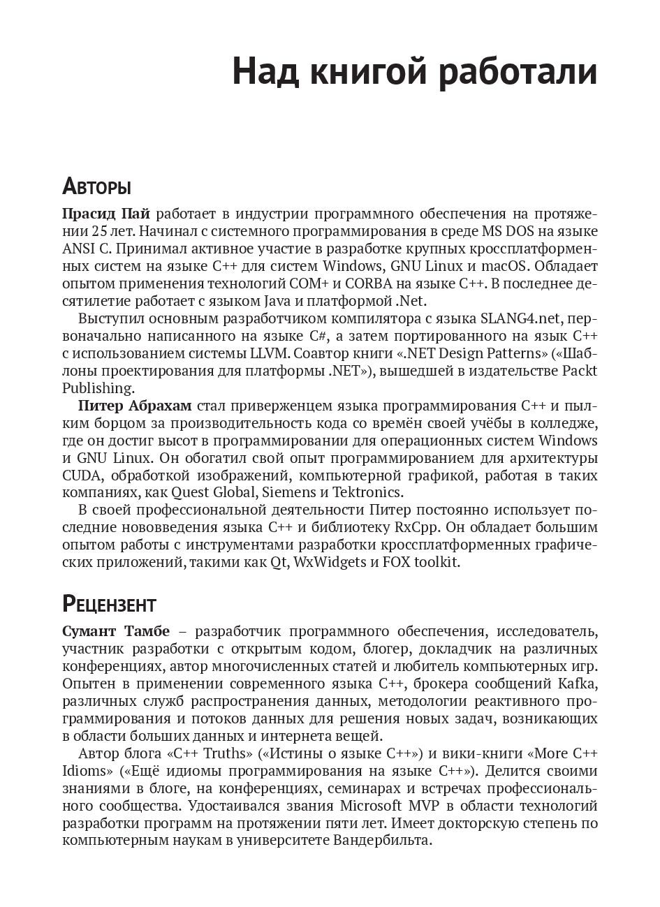 В данной книге изложены понятия и принципы функционального реактивного программирования, помогающие строить параллельные, асинхронные приложения с наименьшими усилиями и минимумом ошибок. Рассмотрен обзор подходов к обработке событий, нашедших применение в ряде программных систем. Описаны средства параллельного, асинхронного и неблокирующего программирования. Изучив эту книгу, вы будете хорошо разбираться в тонкостях реактивной модели программирования и методах её реализации на новейшей версии языка C++ – языке стандарта C++17.