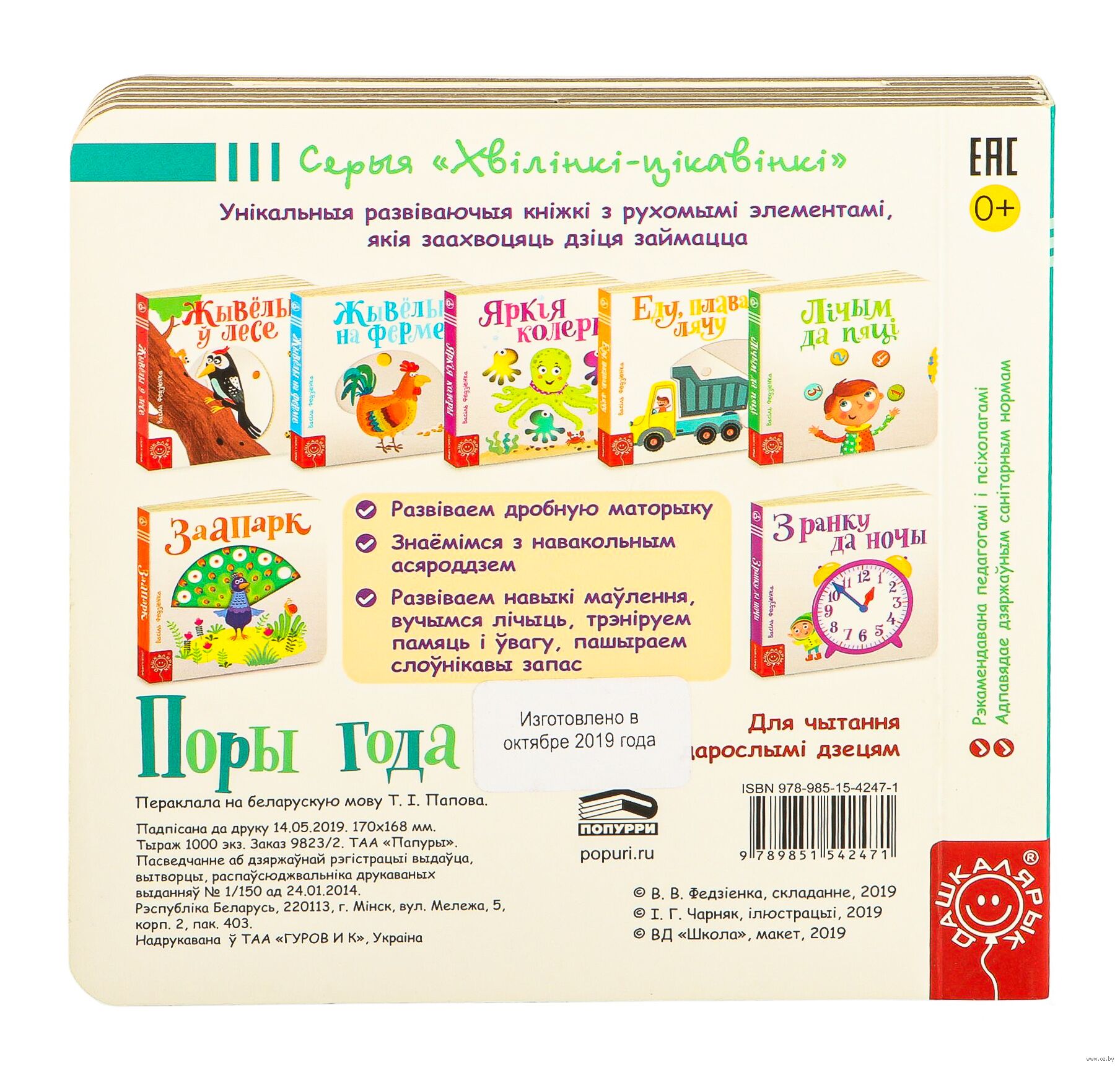 Усе дзеці вельмі любяць чароўныя кніжкі-цацкі з рухомымі малюнкамі. Яны выклікаюць непадробнае захапленне і знаёмяць малечаў з навакольным светам, развіваюць дробную маторыку, навыкі маўлення, лічэння, памяць і ўвагу. Яркія кнігі серыі "Хвілінкі-цікавінкі" зроблены з трывалага глянцавага кардону, таму з імі могуць гуляцца нават самыя маленькія.