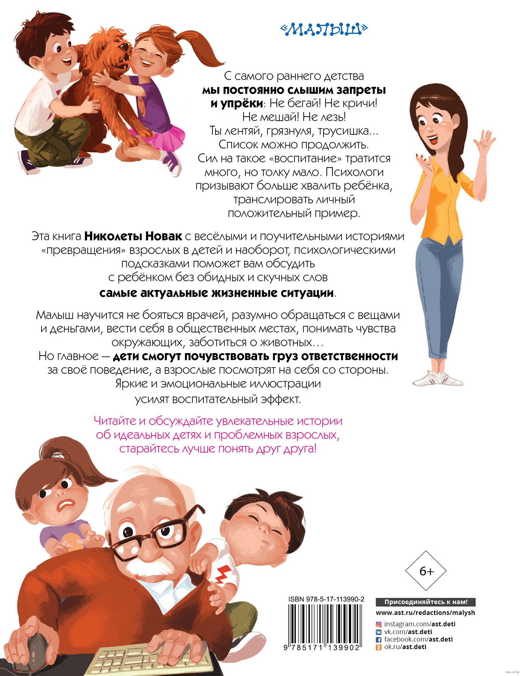 Эта книга Николеты Новак с весёлыми и поучительными историями "превращения" взрослых в детей и наоборот, психологическими подсказками и дневничком настроения поможет вам обсудить с ребёнком без обидных и скучных слов самые актуальные жизненные ситуации.